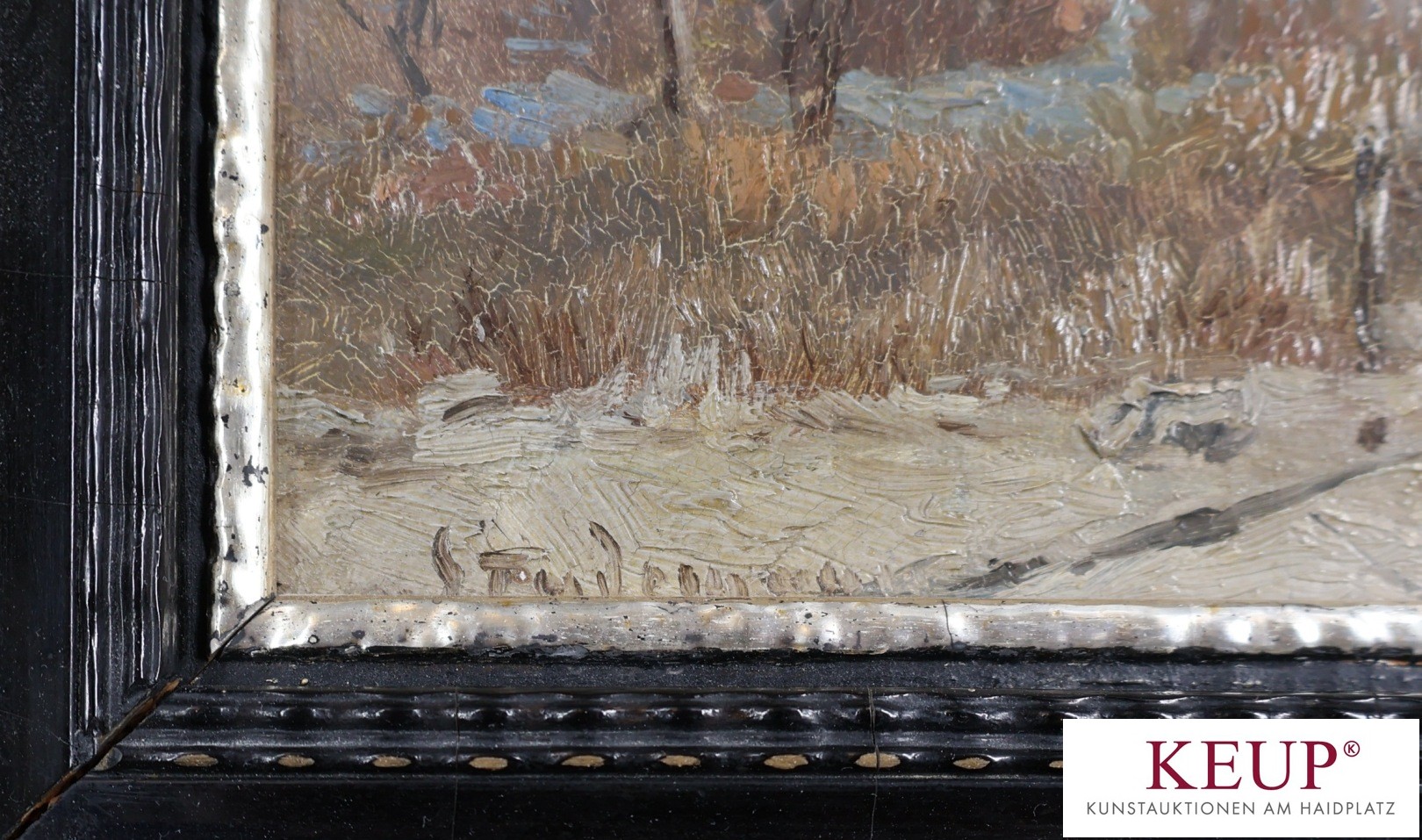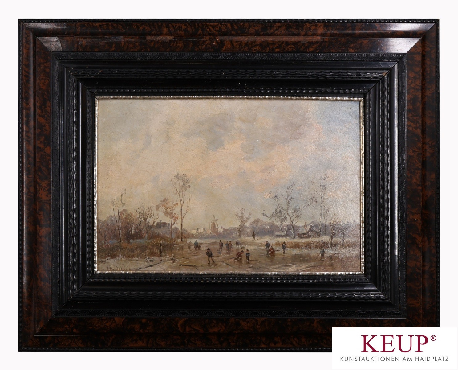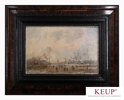 Gemälde - Adolf STADEMANN (1824 München 1895) ''Winterlandschaft mit Eisvergnügen'', l.u. signiert, Öl auf Karton, Maße Darstellung ca. 30x46 cm, Provenienz: Privatbesitz Regensburg, getreppter Rahmen (an oberer Rahmenleiste Furnierschaden), Gesamtmaße ca. 58x75 cm, vgl. Lit.: Unterricht bei Carl August Lebschée und Moritz Eduard Lotze; er spezialisierte sich, angeregt durch die niederländische Landschaftsmalerei des 17.Jahrhunderts, auf Winterlandschaften mit Figurenstaffagen und impressionistisch angehauchte Mondscheinszenen.