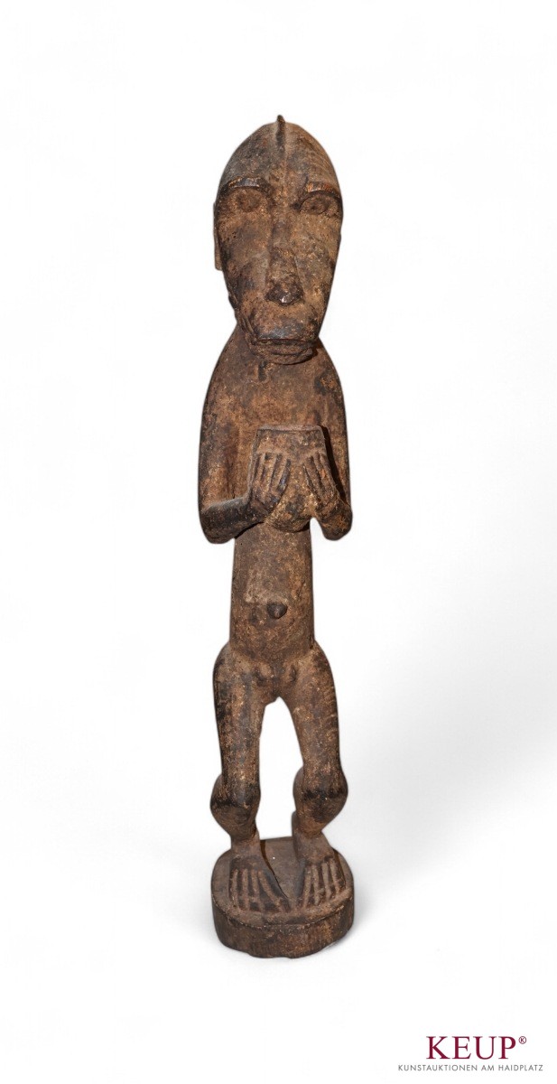 Stammeskunst - wohl Baule Afrika Gbekre, stehende Figur mit Affenkopf und Körper eines Menschen, vor der Brust eine Opferschale, leicht geknickte Beine, Holz geschnitzt, Höhe ca. 57,5 cm, 1700 Gramm, Provenienz: Privatsammlung Regensburg