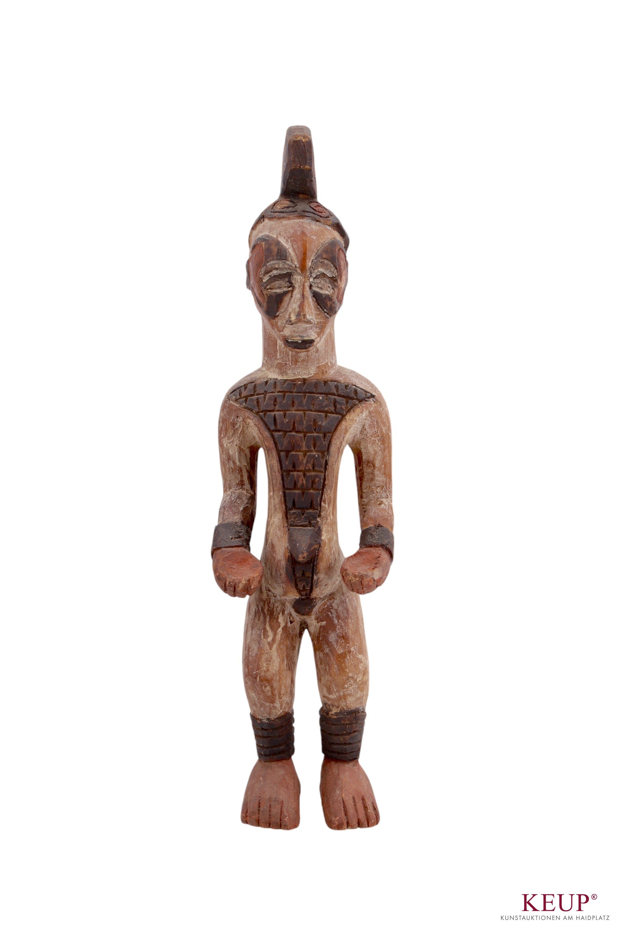 Afrikanische Kunst - Igbo Nigeria braunes Holz, stehende Figur mit weißer Patina, aufwendige Verzierungen, Kopfschmuck, Altersspuren, Höhe ca. 70 cm, Provenienz: Privatbesitz Regensburg