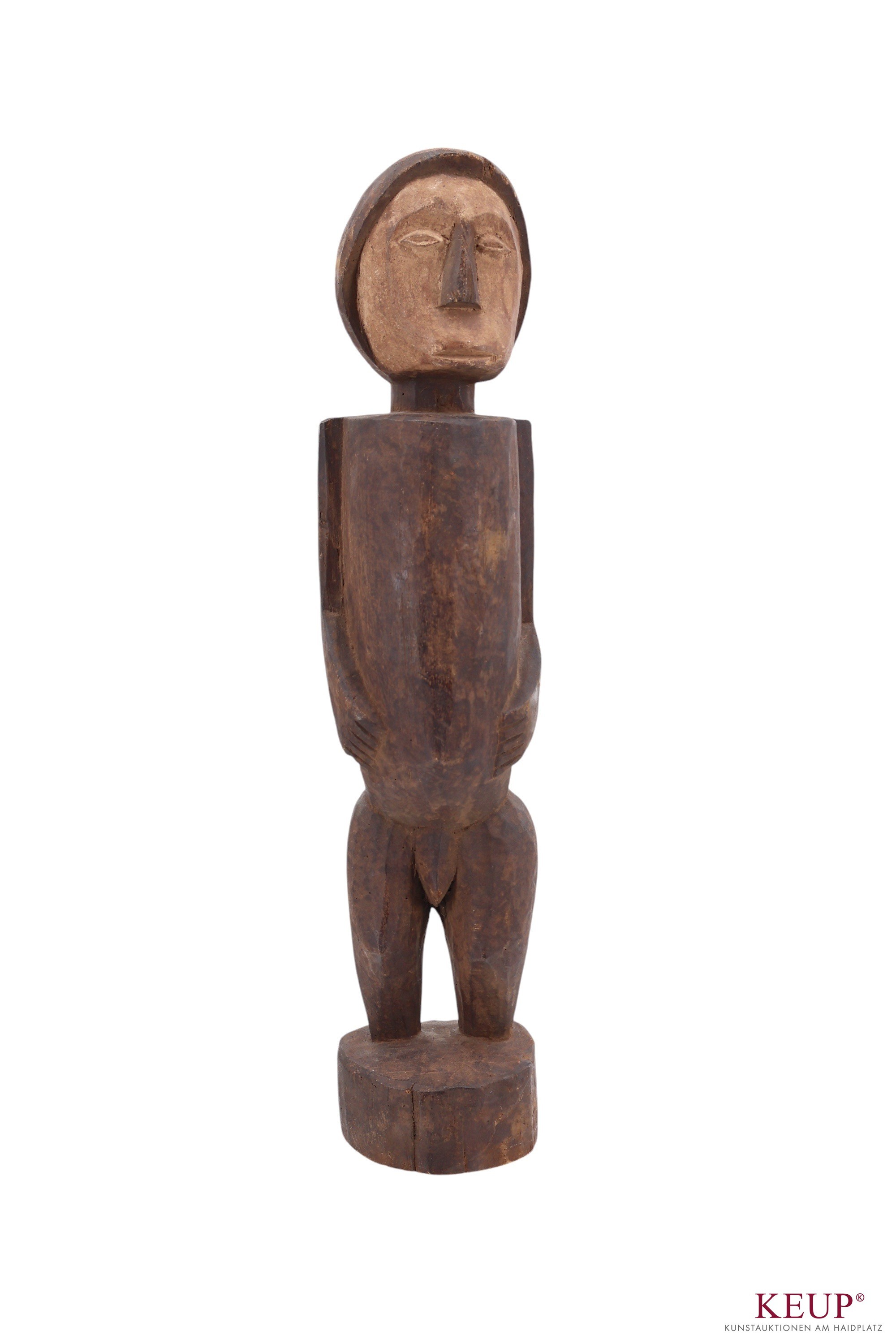 Afrikanische Kunst Ahnenfigur, braune Holz, männliche Figur mit den Armen am Körper, Altersspuren, Höhe ca. 67 cm, Provenienz: Privatbesitz Regensburg