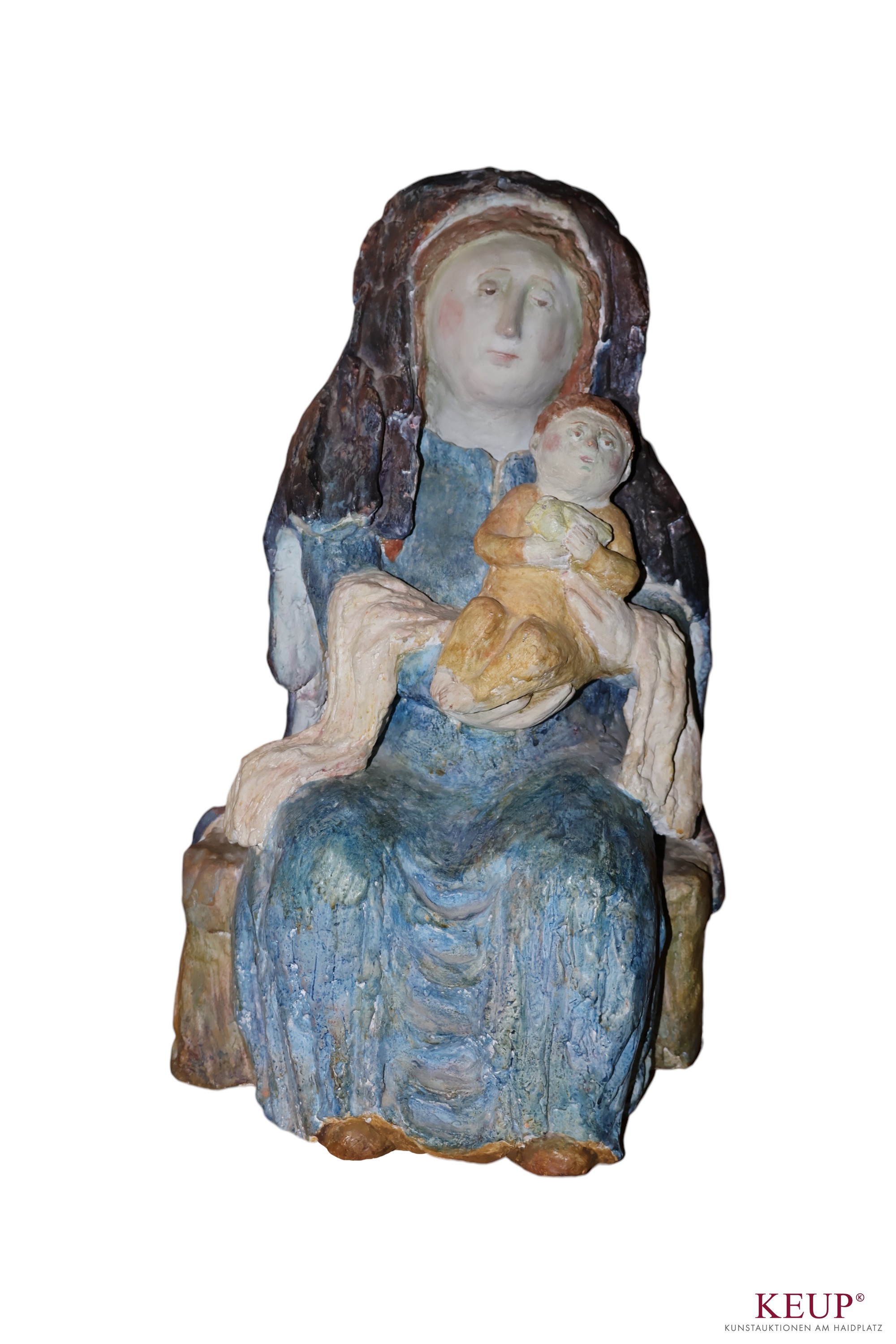 Skulptur - Anemone Schneck-Steidl (1934 Sonthofen/Allgäu -2020 München) ''Maria mit Kind'', Ton farbig staffiert, Höhe ca. 50 cm, Holzsockel, Gesamthöhe ca. 140 cm, Provenienz: Nürnberg, vgl.Lit.: Studium an der Akademie der Bildenden Künste in München, als Meisterschülerin von Richard Seewald; Atelier in München; Arbeiten im öffentlichen Raum, u.a. 1968 Friedenstaube in der Kirche Detmold-Remmighausen, Genesis im Bezirkstag Augsburg, Psyche im Bezirkskrankenhaus Günzburg, 1985 Schwabinger Kunstpreis im Bereich Plastik/Bildhauerei; 1993 Kunstpreis des Bezirks Schwaben