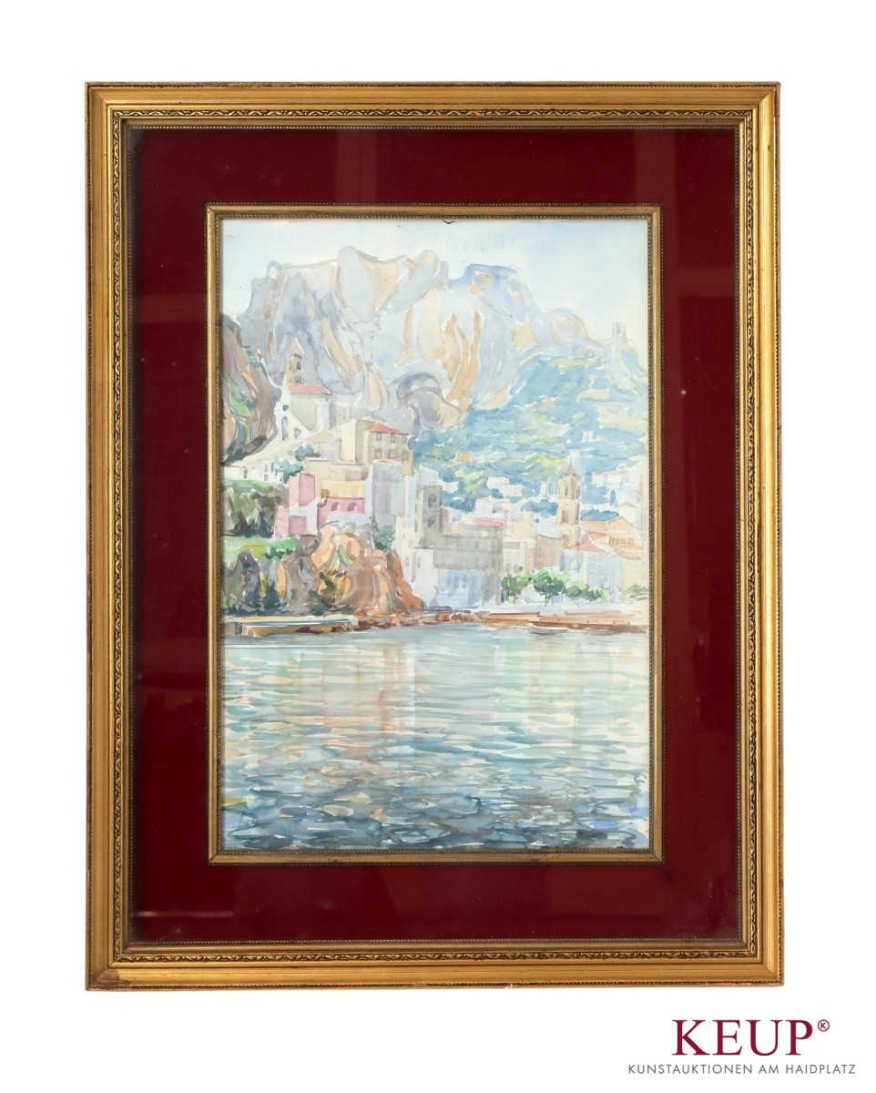 Aquarell - Anonymer Künstler (XX.Jahrhundert) ''Blick auf Amalfi'', l.u. unleserlich signiert, lasierende Farben auf Papier, Maße Darstellung ca. 48x32 cm, Passepartout, verglaster Rahmen, Gesamtmaße ca. 67x51 cm, Provenienz: Privatbesitz Regensburg