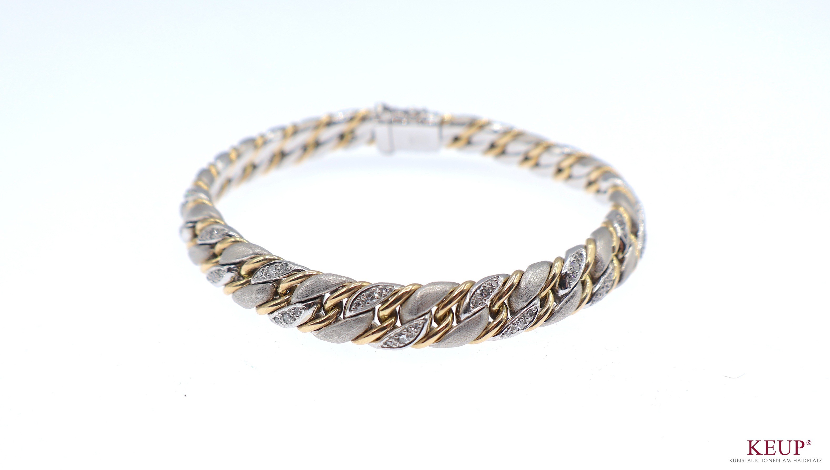 Goldenes Armband bicolor, Gelbgold/Weißgold gest. 585, reich dekoriert mit kl. Brillanten, Länge ca. 19 cm, Steckverschluss mit Sicherheitsachter, 36 Gramm, Provenienz: Privatbesitz Regensburg