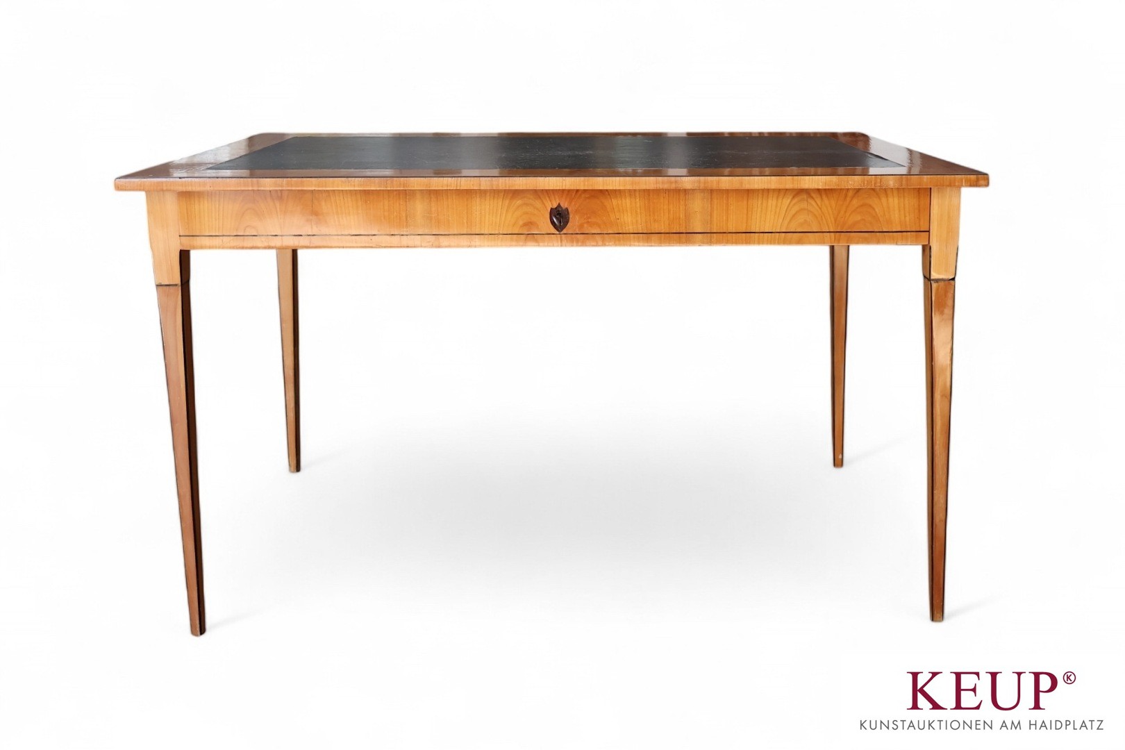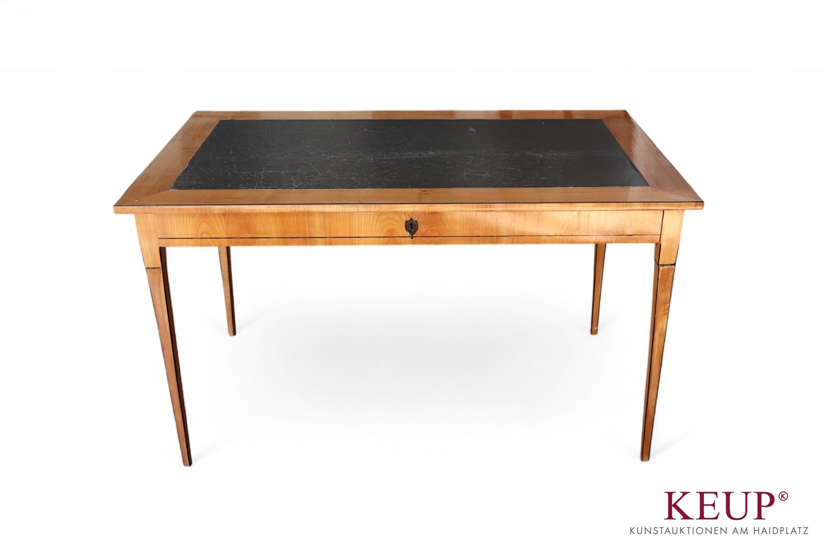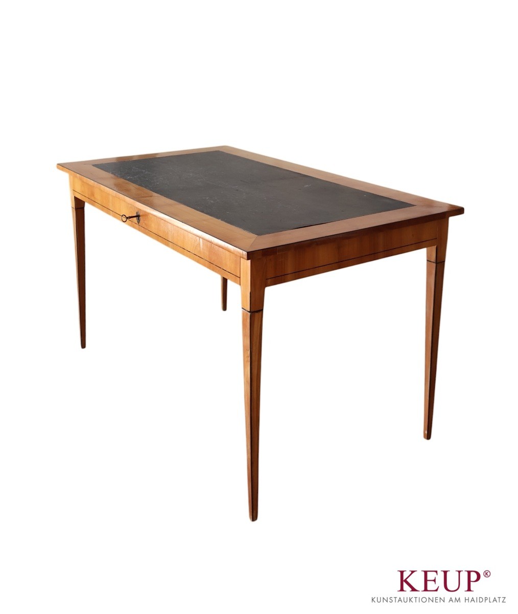 Biedermeier Schreibtisch - wohl süddeutsch Ende 19.Jahrhundert Kirschbaum furniert, rechteckige Platte mit Schreibeinlage, Zarge mit Schublade, hohe konische Beine, Altersspuren, Maße ca.135x78 cm, Höhe 78 cm, Provenienz: ehem. Privatbesitz Regensburg