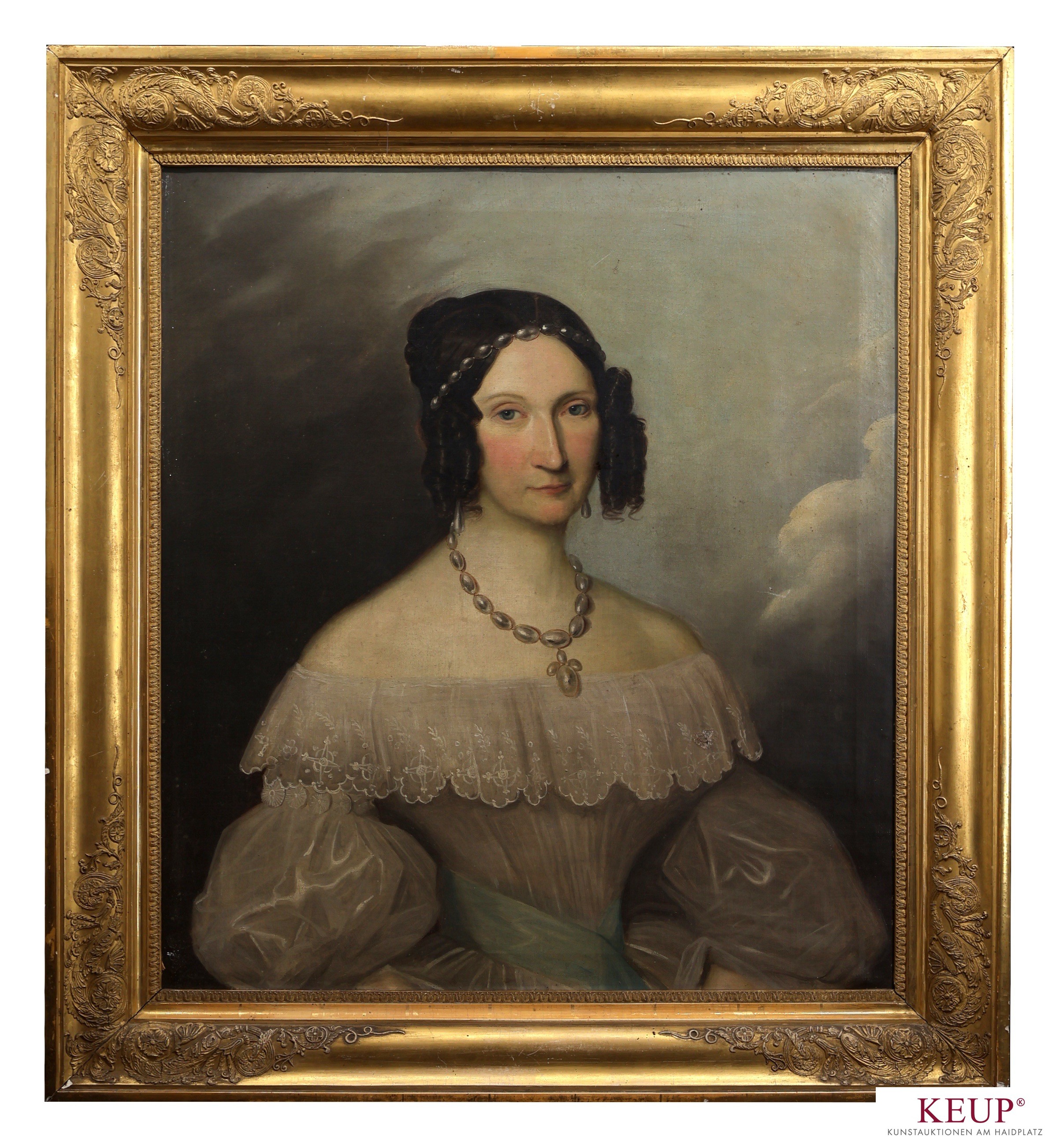 Biedermeiergemälde - wohl Deutschland oder Österreich 1.H.19.Jahrhundert ''Damenbildnis mit weißem Spitzenkleid und Perlenkette'', unsigniert, Öl auf Leinwand, Maße Darstellung ca. 65x57 cm, Goldrahmen, Gesamtmaße ca. 82x73 cm, Provenienz: Privatbesitz Straubing