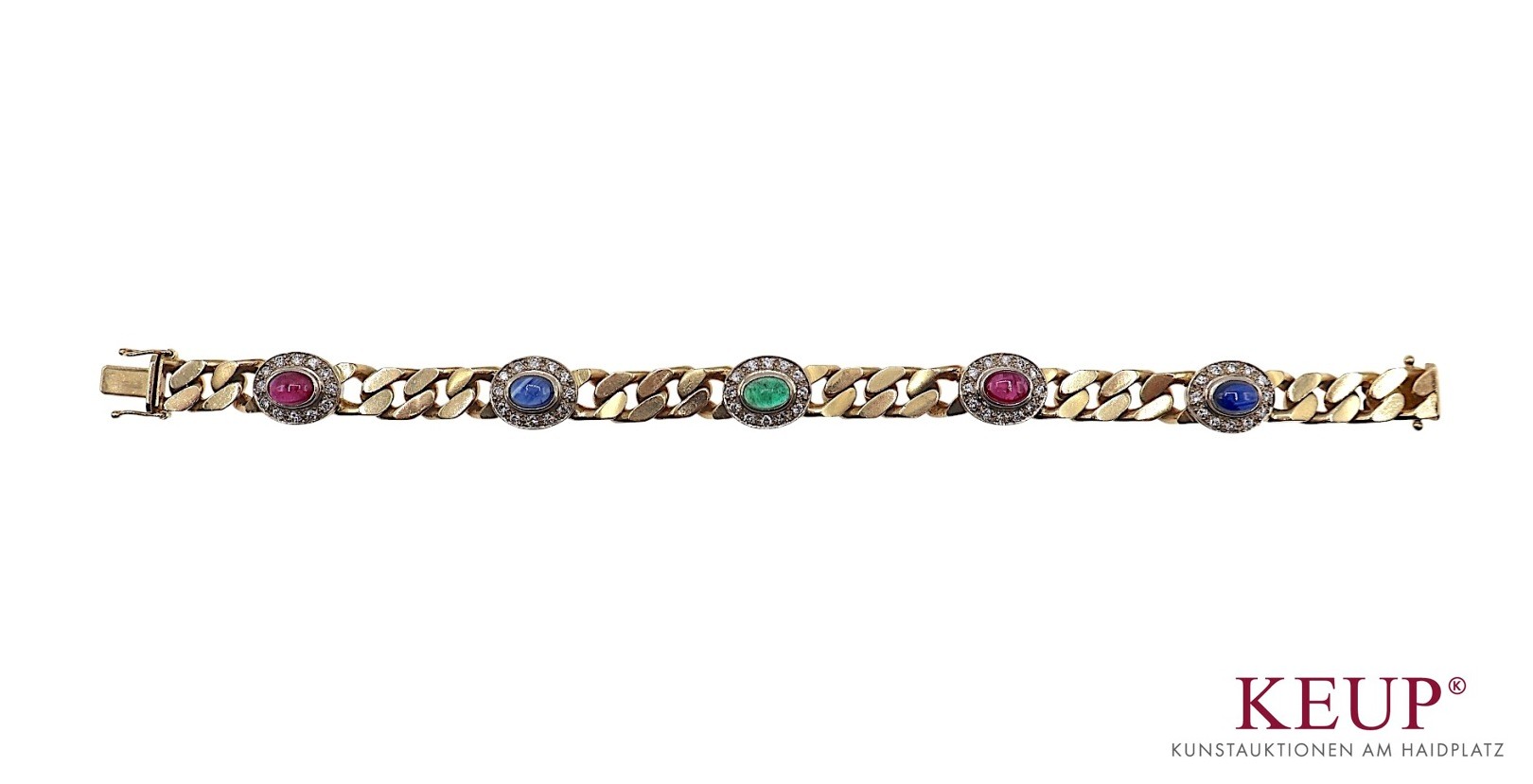 Goldenes Cabochonarmband verziert mit 2 Saphircabochons, 2 Rubincabochons und einem Smaragdcabochon, umrandet jeweils von 12 kl. Brillanten, Steckverschluss mit Sicherheitsachter, Gesamtgewicht ca. 39 Gramm, Länge ca. 20 cm, Provenienz: Privatbesitz Regensburg