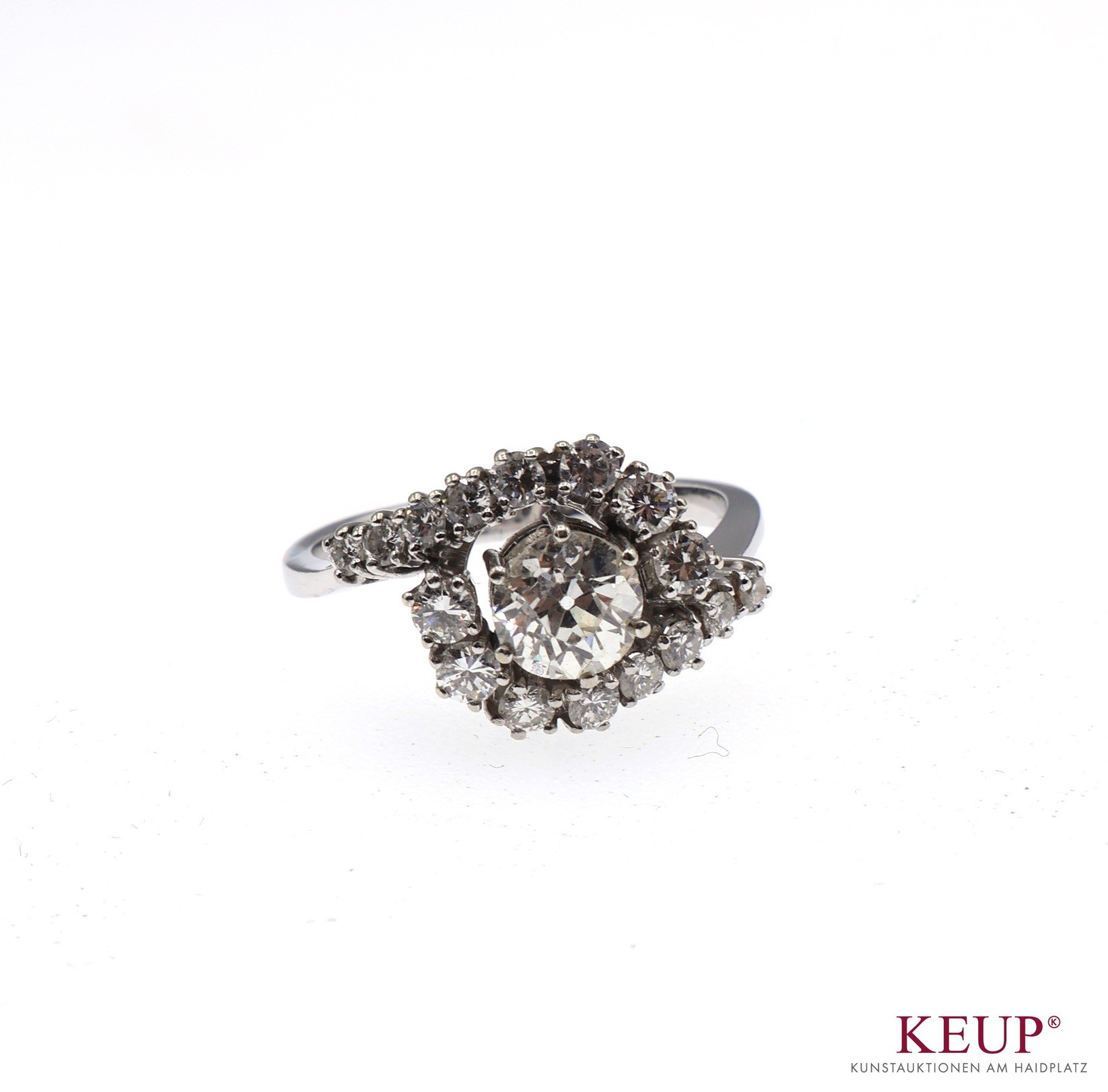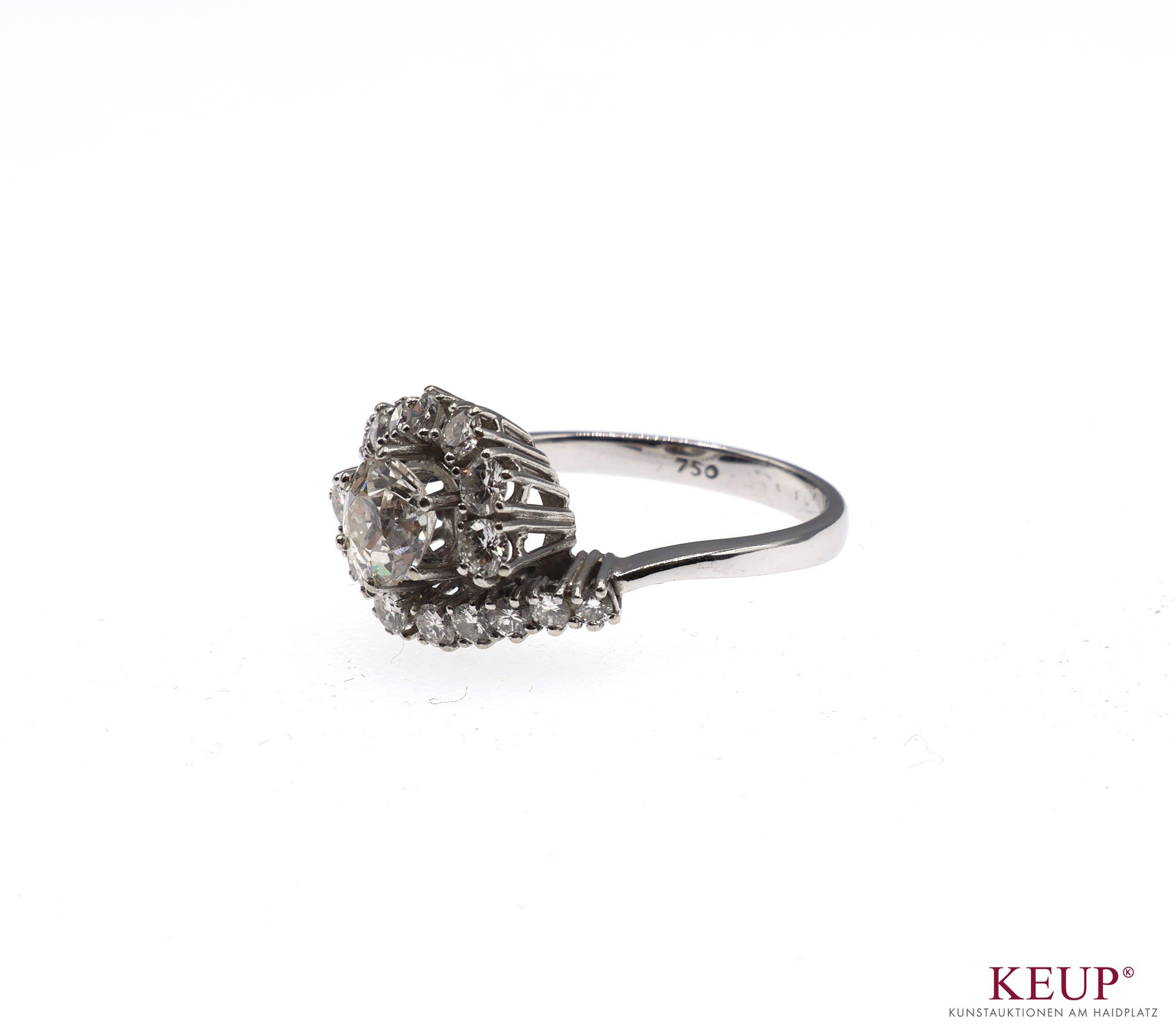 Goldener Damenring mit Brillantsolitär (bestoßen) umrandet von 16 kl. Brillanten, Weißgoldfassung gest. 750, Ringgröße 55, ca. 3,8 Gramm, Provenienz: Landkreis Regensburg