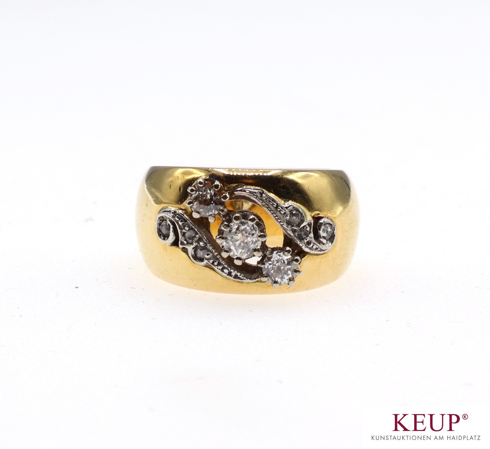 Goldener Damenring Gelbgold gest. 750, mit 3 parallel angeordneten Brillanten ausgefasst, umrandet von kleinen Brillanten, Ringgröße 49, ca.18,3 Gramm, Provenienz: Landkreis Regensburg