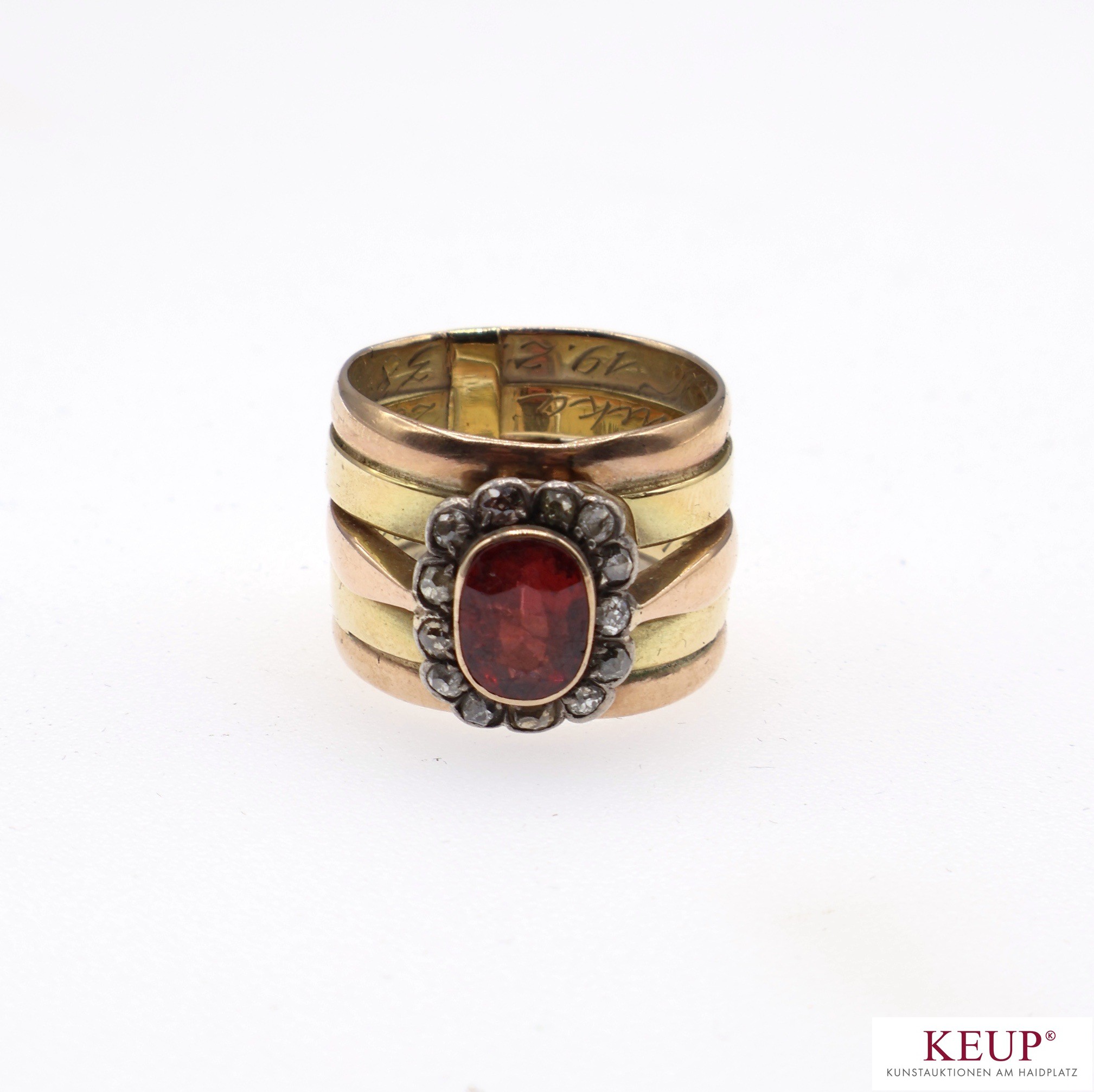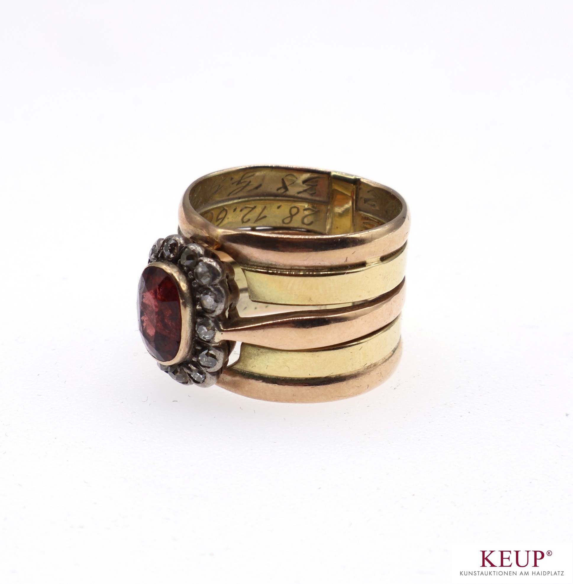 Goldener Damenring Mariage aus 5 versch. Ringen, versch. Gold, Mittelring dekoriert mit rotem Schmuckstein und kl. Brillanten ausgefasst, Ringgröße 56, ca. 12,2 Gramm, Provenienz: Landkreis Regensburg