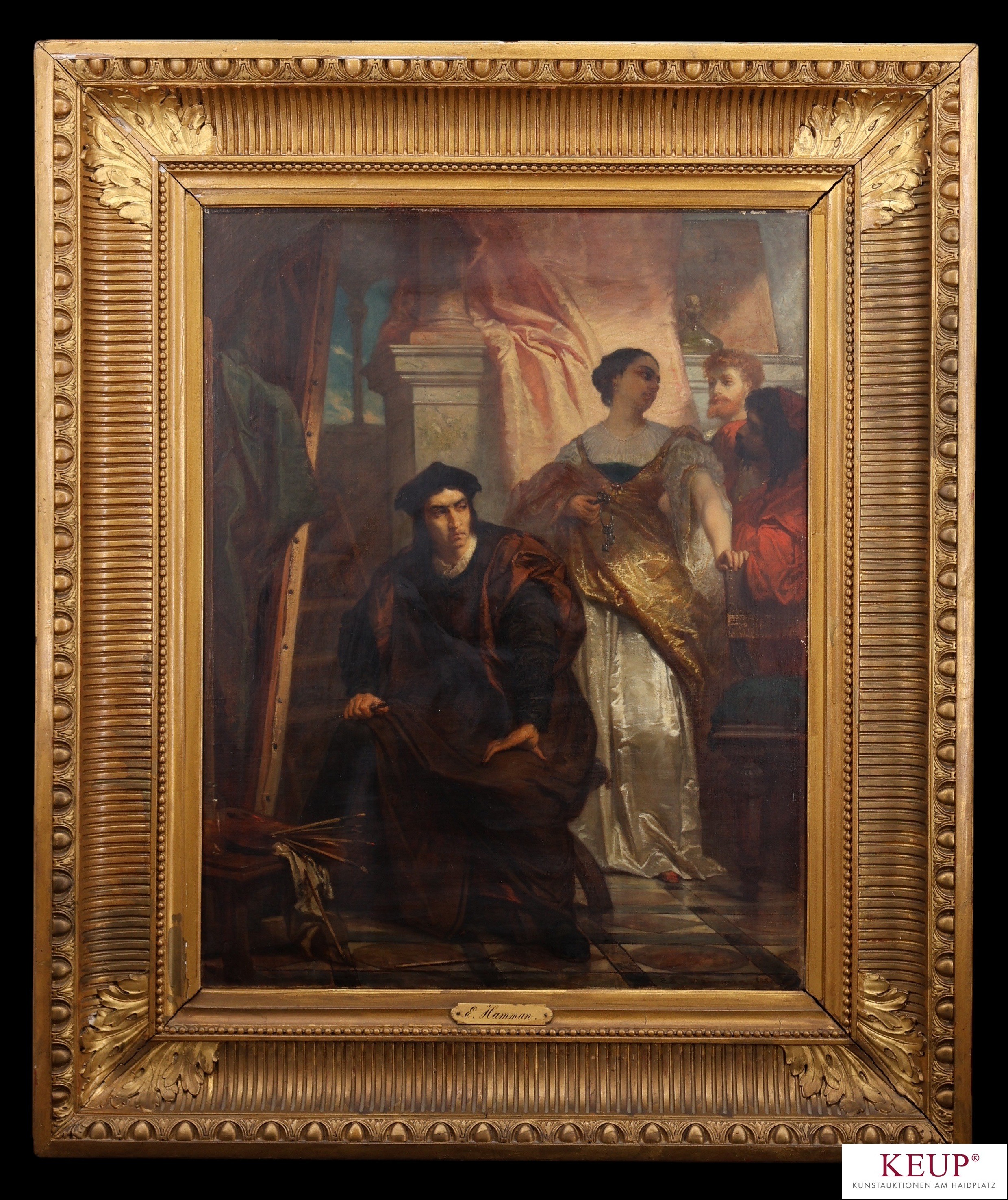 Großes Gemälde - Edouard Jean Conrad HAMMAN (1819 Ostende -1888 Paris) ''Im Atelier, Künstler von Staffelei nebst Gattin mit Pagen'', r.u.signiert, wohl datiert 1858, Öl auf Leinwand, Maße Darstellung ca. 76x58 cm, Goldrahmen, Gesamtmaße ca. 106x88 cm, Provenienz: Privatbesitz Niederbayern, vgl. Lit.: belgisch-französischer Historienmaler; 1837 Schüler von Nicaise de Keyser im Vleeshuis in Antwerpen; ab 1846 in Paris; 1847-1887 in Salon de Paris; 1848 Goldene Medaille in Brüssel; 1853 bis 1863 unterschiedliche Medaillen in Paris; 1854 Ritter des Leopoldordens, 1864 Ritter der Ehrenlegion; 1857 Ritter des Ordine dei Santi Maurizio e Lazzaro