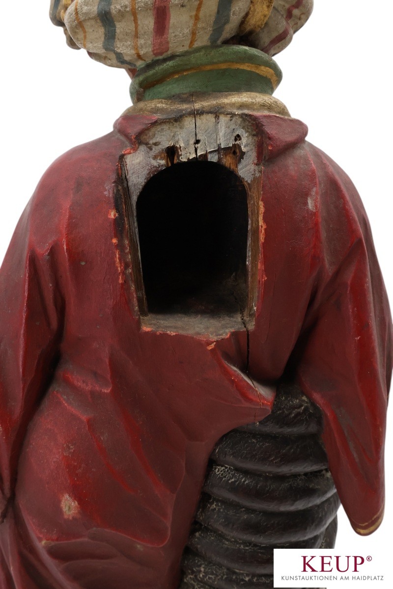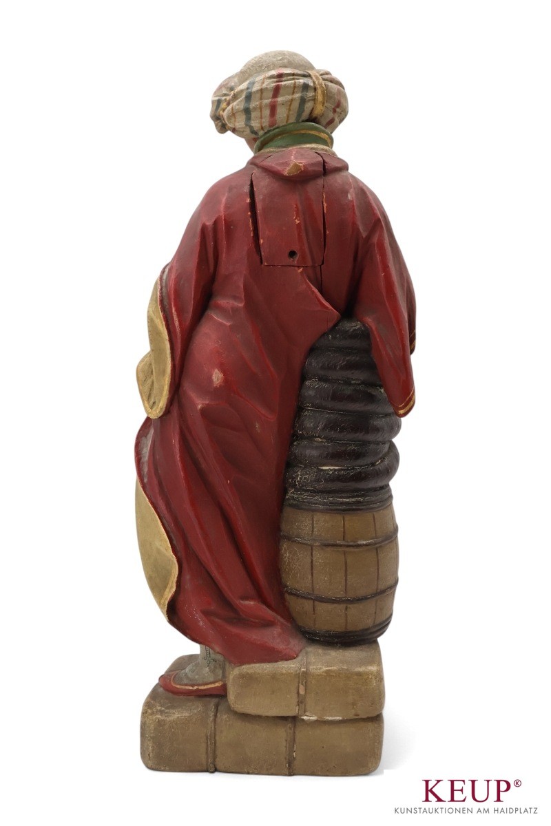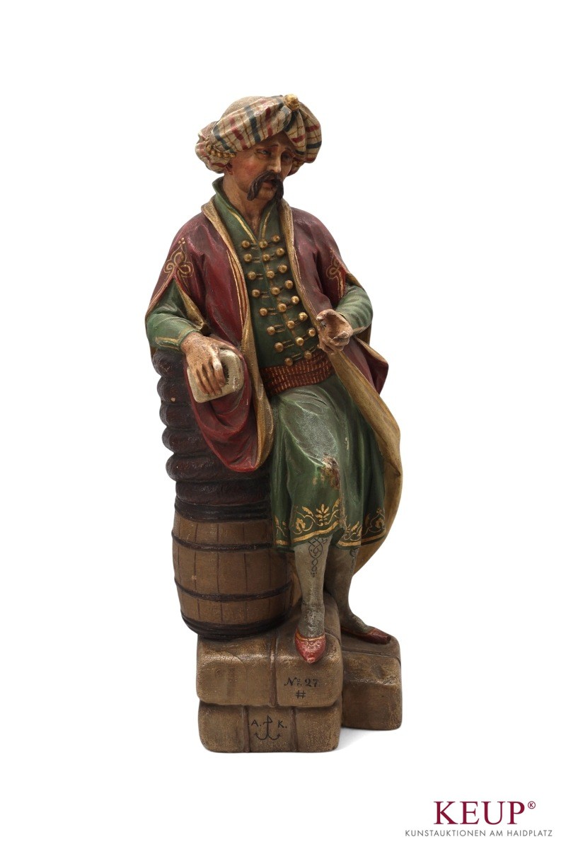 Figur - wohl deutsch nach 1900 ''Stehender Mann in orientalischer Tracht an Fass lehnend'', wohl Schaustück für einen Tabak- oder Weinladen, Holz bemalt, aufgemalte Marke ''Anker mit den Buchstaben A.K.'', No. 27 rückseitig Fach, Höhe ca. 67 cm, Altersspuren (Fassung, 2 Finger fehlen), Provenienz: Privatbesitz Regensburg