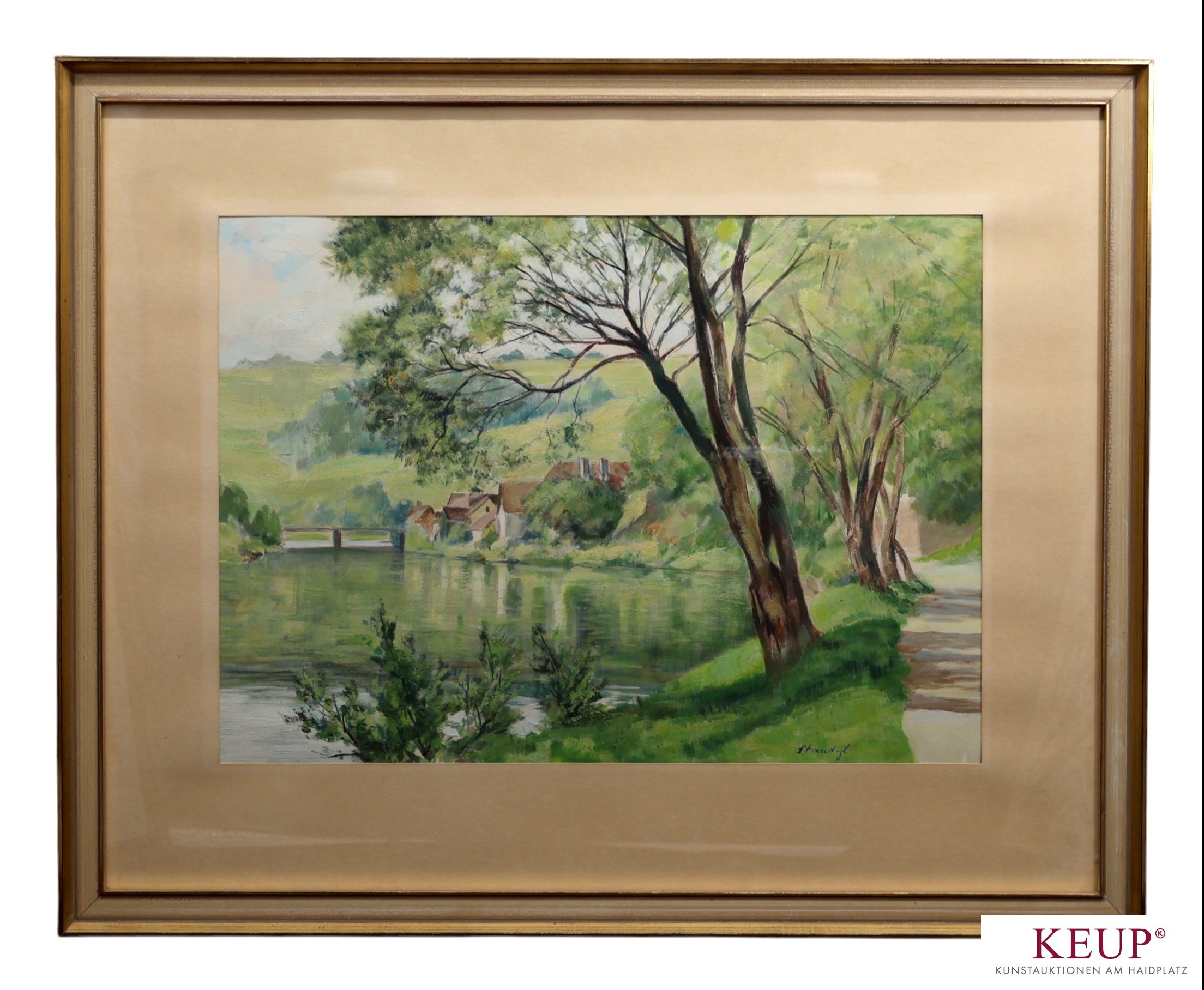Aquarell - Franz Staudigl (1885 Wien - 1944 Passau) ''Hals (Stadtteil von Passau)'', r.u. signiert, lasierende Farben auf Papier, Maße ca. 38x53 cm, Passepartout, Rahmen, Gesamtmaße ca. 60x75 cm, Provenienz: Regensburg, vgl. Lit.: österreichischer Maler; 1904-1910 Besuch an der Akademie der Bildenden Künste in Wien, 1914 Umsiedlung nach Passau; 1991 Gedächtnisausstellung im Neuen Galeriegebäude des Oberhausmuseums in Passau