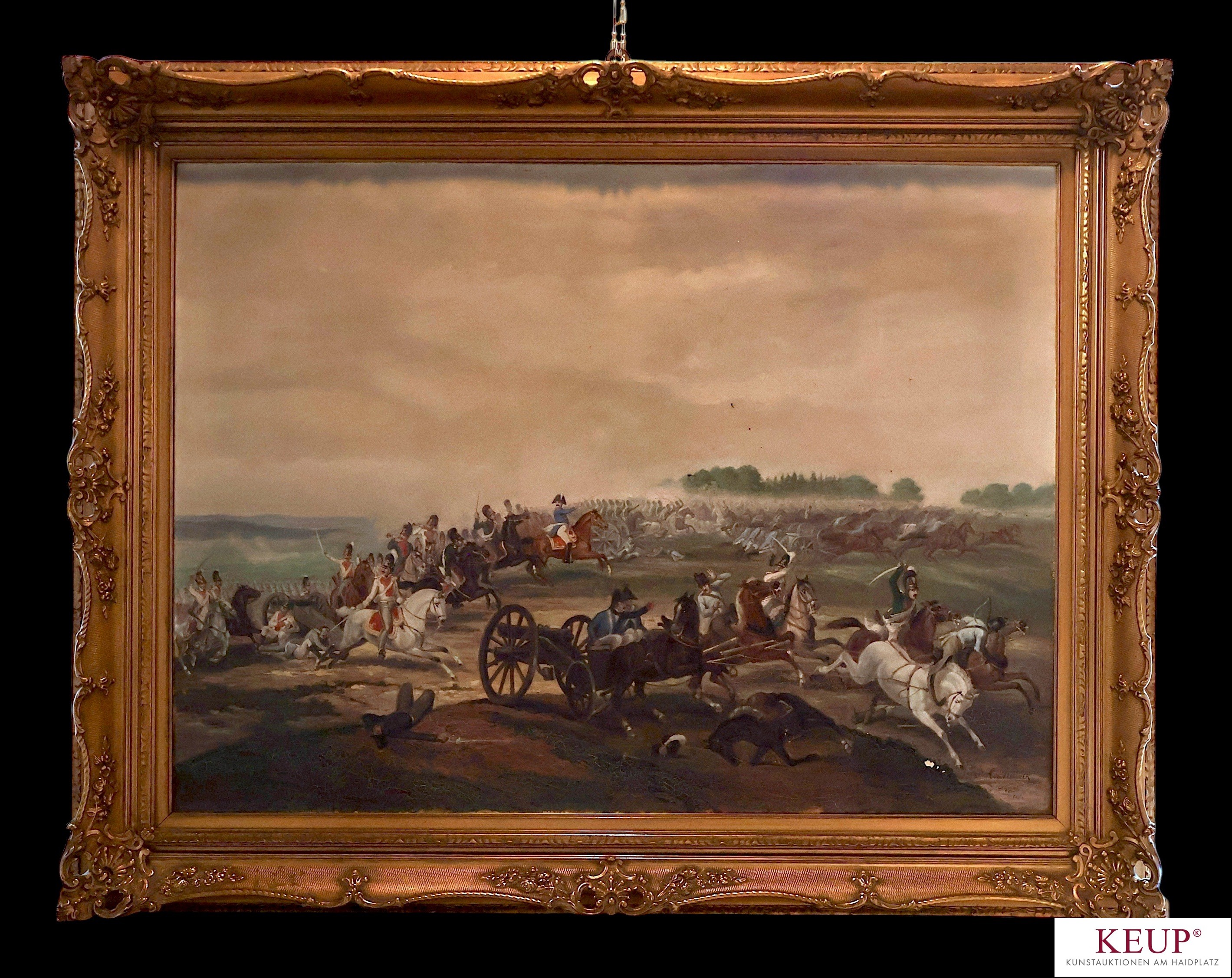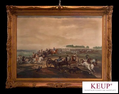 Großes Gemälde - nach Karl Wilhelm Heideck (1788-1861) ''Schlacht bei Eggmühl 1809 - Kampf Napoleons Truppen gegen die Österreicher'', r.u. beschriftet, Öl auf Leinwand, laut rückseitigem Etikett wurde das Original - Gemälde vom Kaiser von Russland gekauft und in der Galerie Zarskoje-Selo ausgestellt, wohl Kopie aus dem XX.Jahrhundert, Altersspuren (u.a. Farbfehlstellen, löchrig), Maße Darstellung ca. 84x114 cm, Goldrahmen, Gesamtmaße ca. 118x138 cm, Provenienz: Privatbesitz Oberbayern aus Regensburger Nachlass