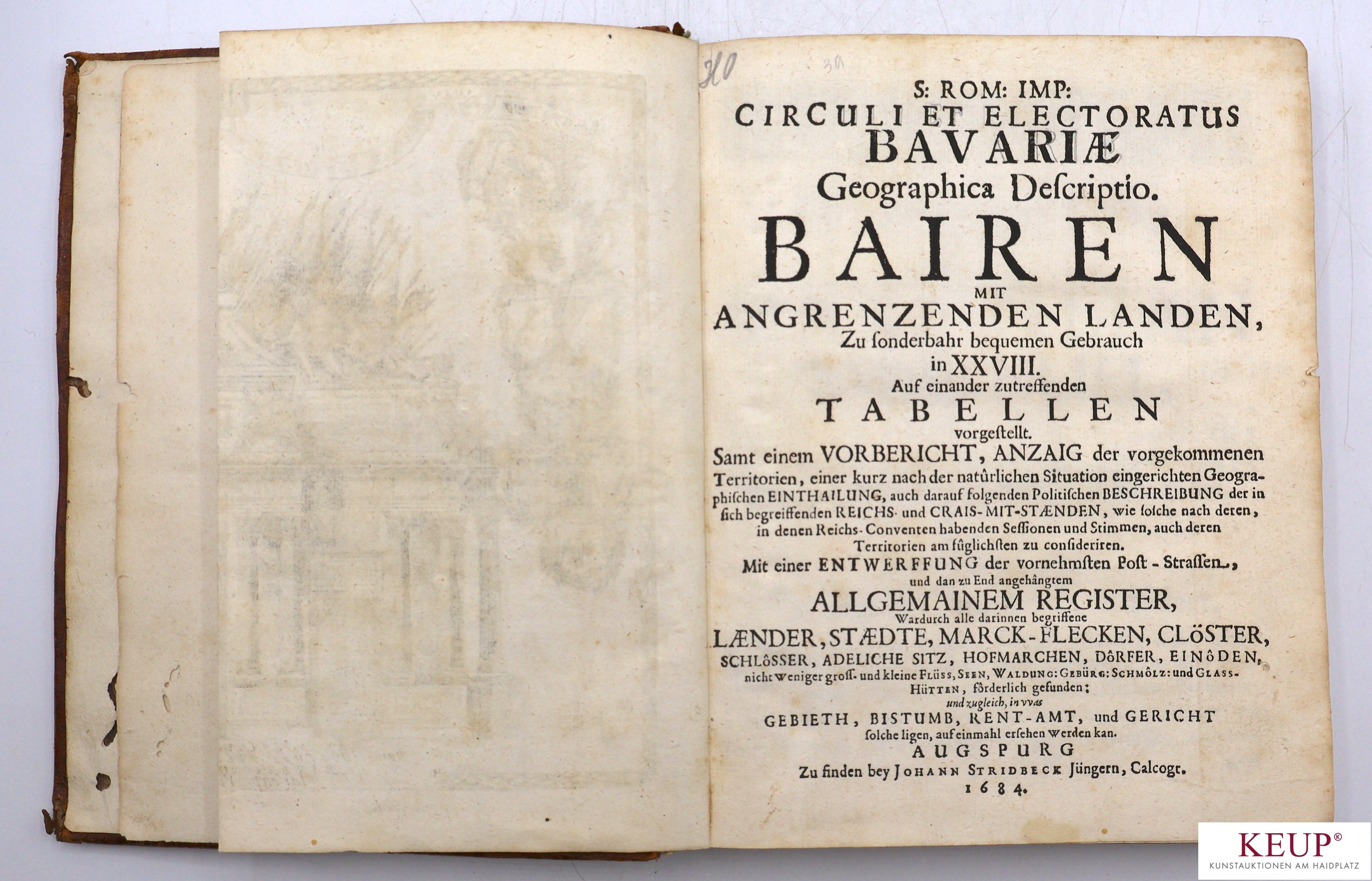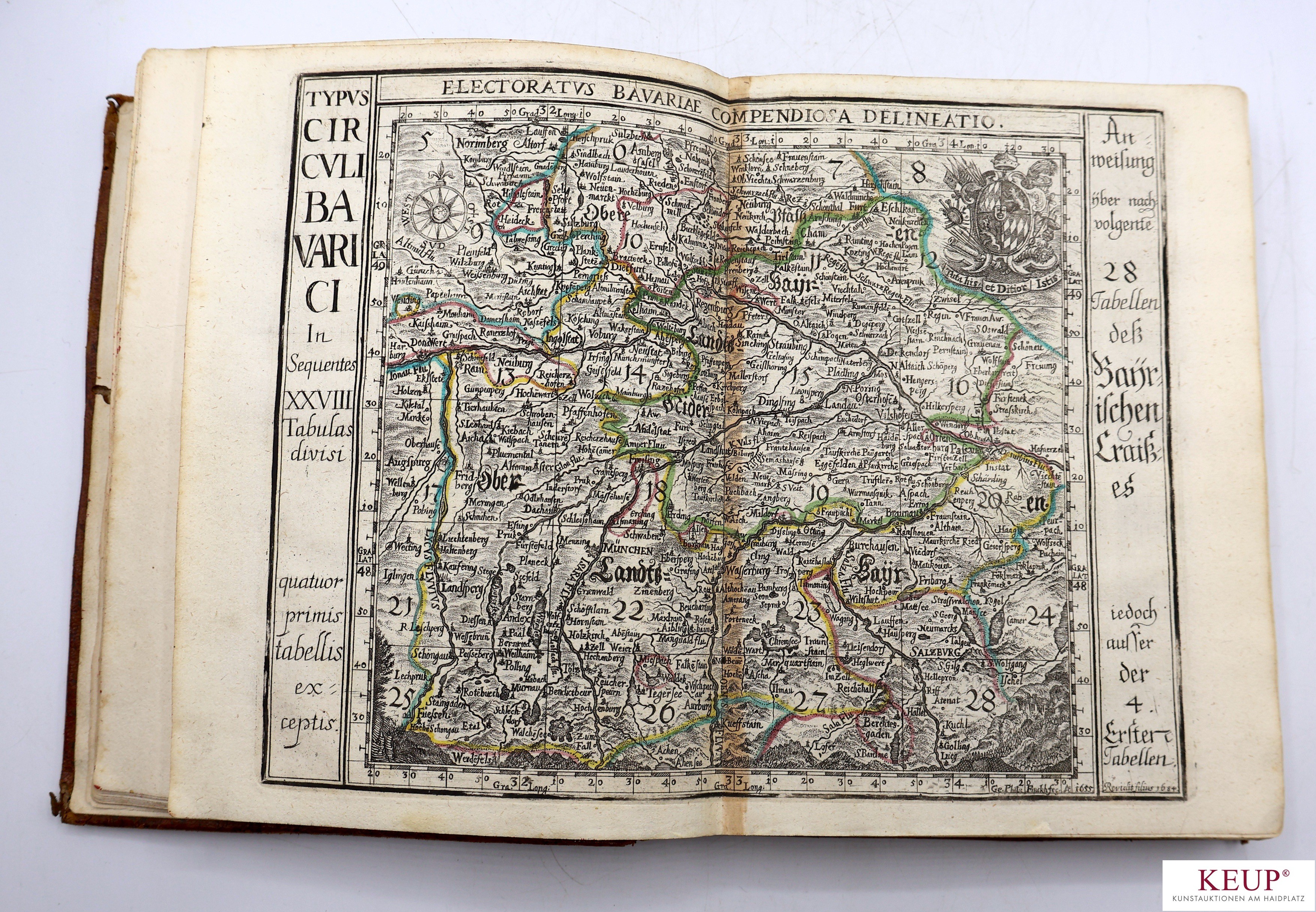 Buch - Georg Philipp Fink (1606 Dachau - 1679 Freising) ''Bayern - Circuli et Electoratus Bavariae geographica descriptio. - Bairen....'', Verlag Stridbeck, Augsburg 1684, illustriert mit Kupfertafeln, nicht kollationiert, Ledereinband, Maße ca. 20,5x16,5 cm, Altersspuren, Provenienz: Privatbesitz Regensburg