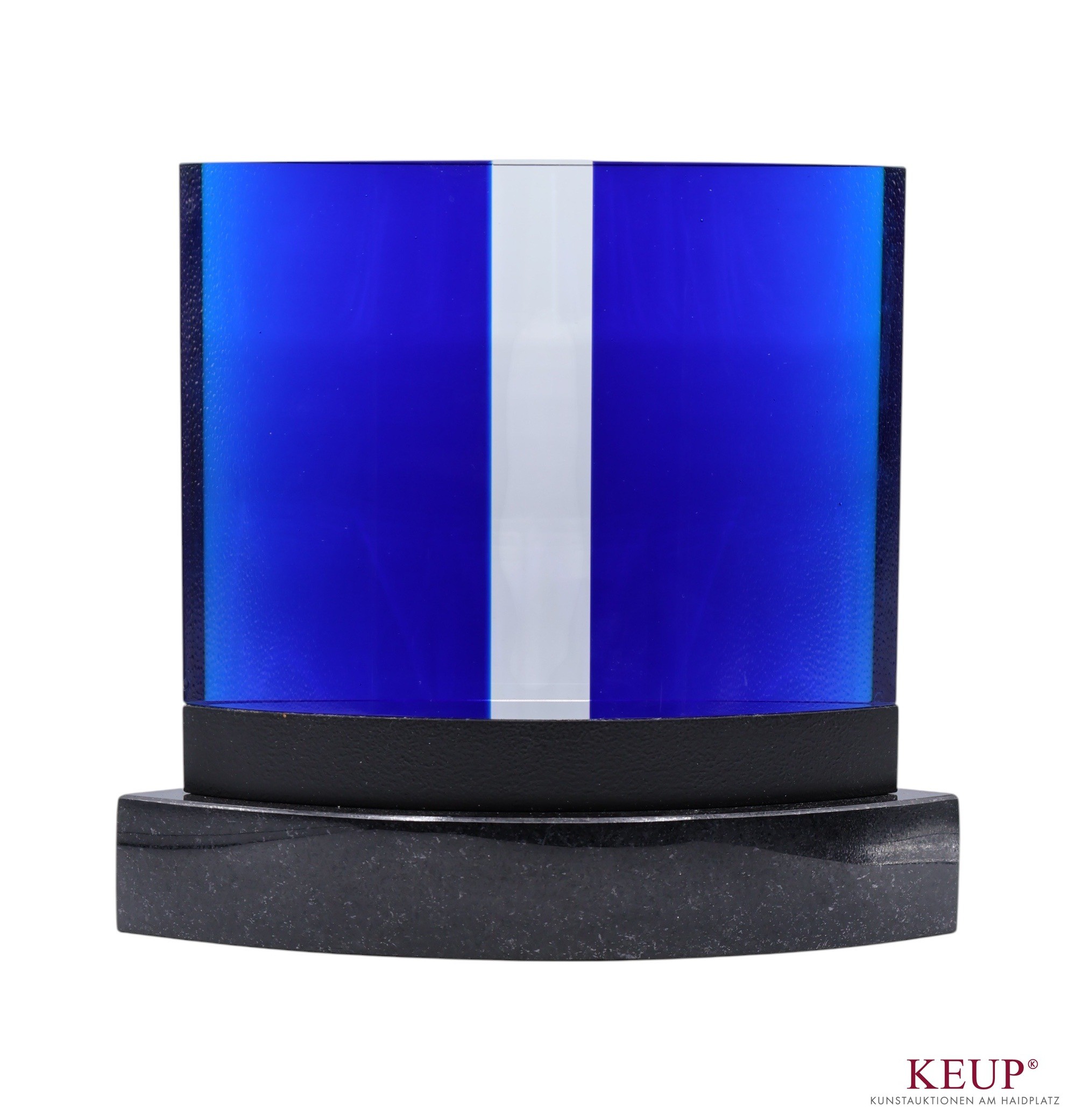 Glasobjekt - Gerd KRUFT (1939 Essen 2013) ''Ohne Titel'', signiert und datiert 2005, Glas farblos/blau, Steinsockel, schwere Ausführung, Gesamtmaße ca. 26,5x31x10,5 cm, Provenienz: Privat Kunstsammlung Oberpfalz, vgl.Lit.: 1954-1957 Glasschleifer und -gestalter, Glasfachschule Rheinbach; 1963 Meisterprüfung in Hamburg, Übernahme der F.W. Schäfer K.G., Werkstätten für dekorative Glasbearbeitung; 1975 Gründung der Essener Glasgalerie; 1981 eigener Studio-Glasofen; seit 1999 freischaffender Künstler.