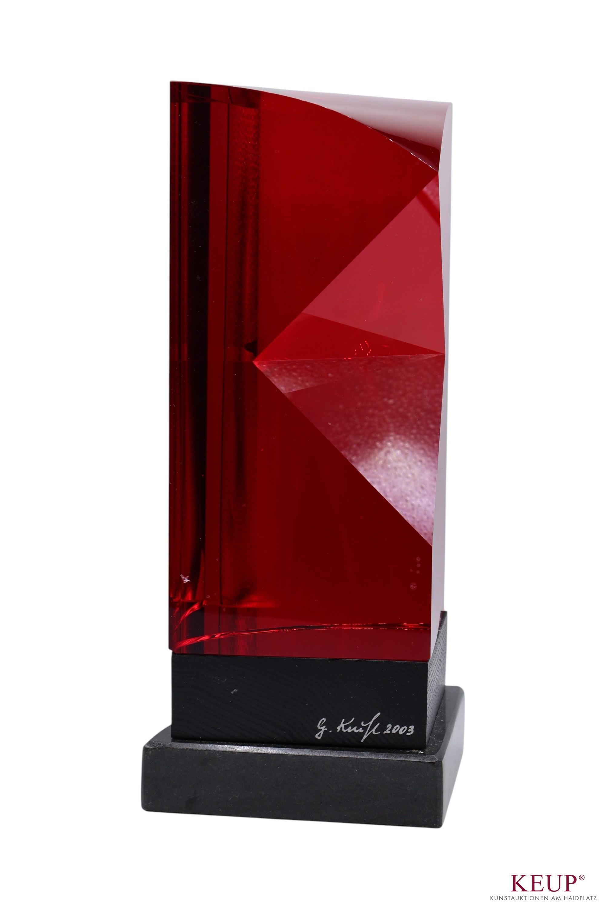 Glasobjekt - Gerd KRUFT (1939 Essen 2013) ''Ohne Titel'', signiert und datiert 2005, Glas, rot, Steinsockel, schwere Ausführung, Gesamtmaße ca. 29x17x12 cm, Provenienz: Private Kunstsammlung Oberpfalz, vgl.Lit.: 1954-1957 Glasschleifer und -gestalter, Glasfachschule Rheinbach; 1963 Meisterprüfung in Hamburg, Übernahme der F.W. Schäfer K.G., Werkstätten für dekorative Glasbearbeitung; 1975 Gründung der Essener Glasgalerie; 1981 eigener Studio-Glasofen; seit 1999 freischaffender Künstler.