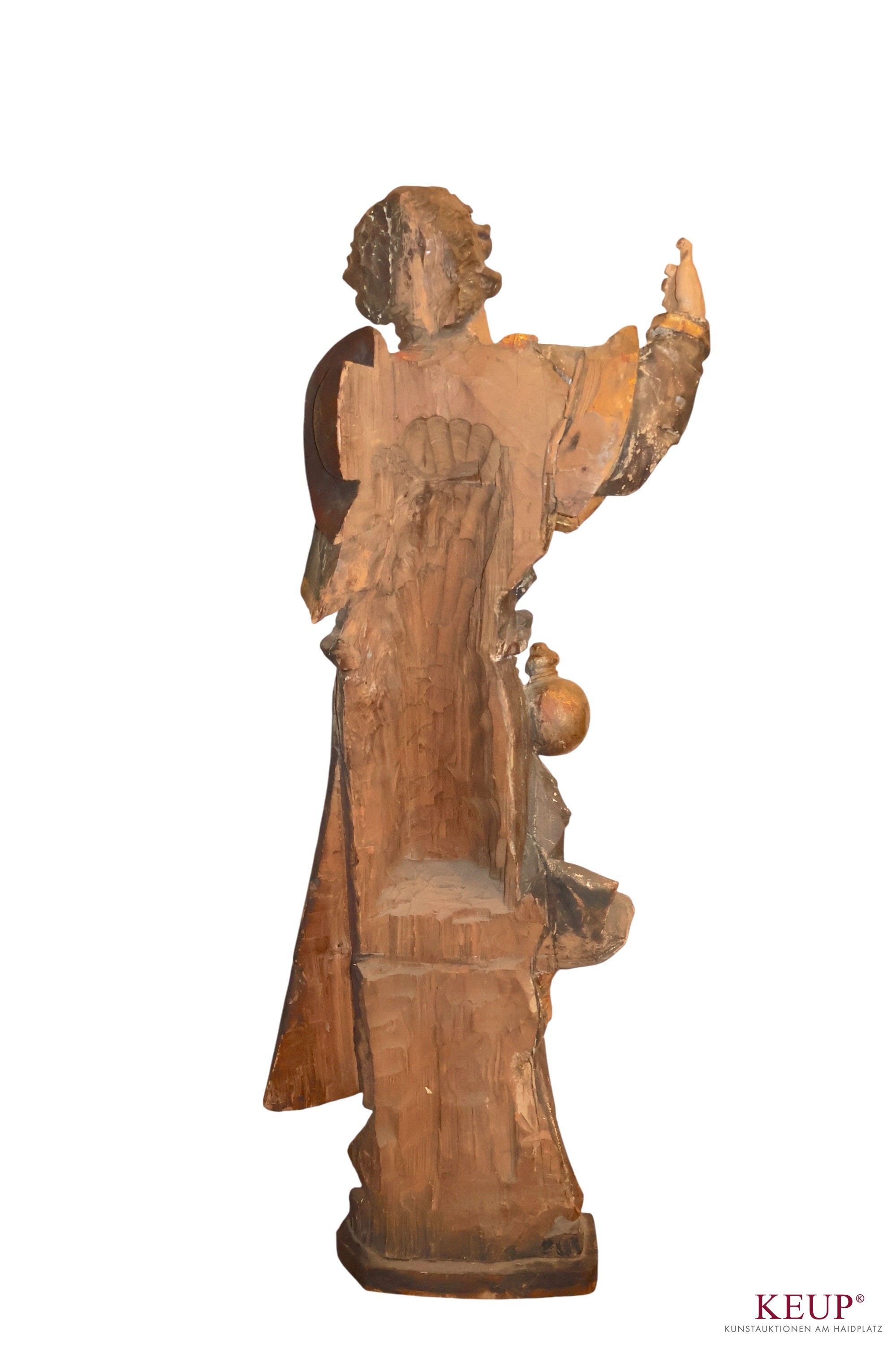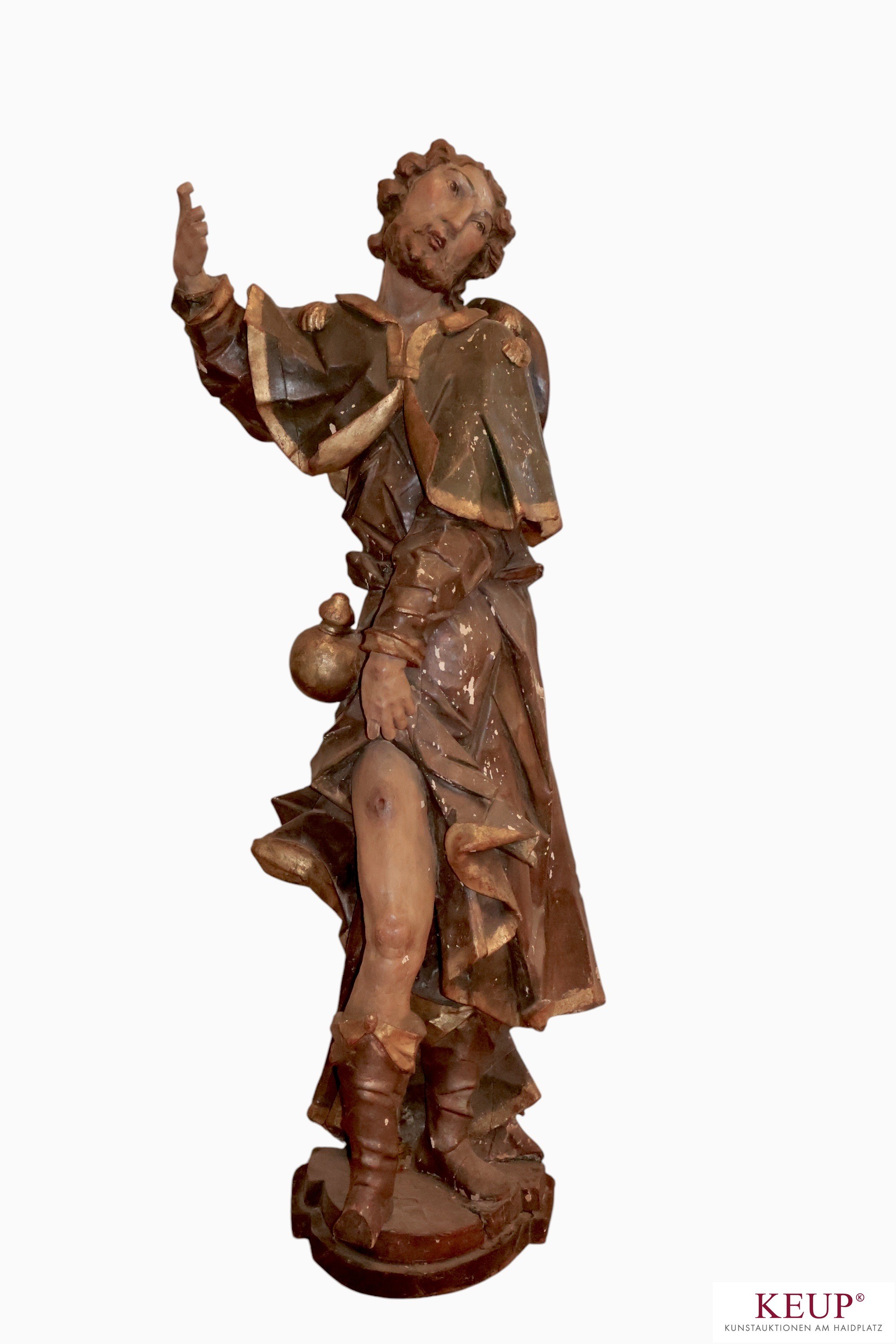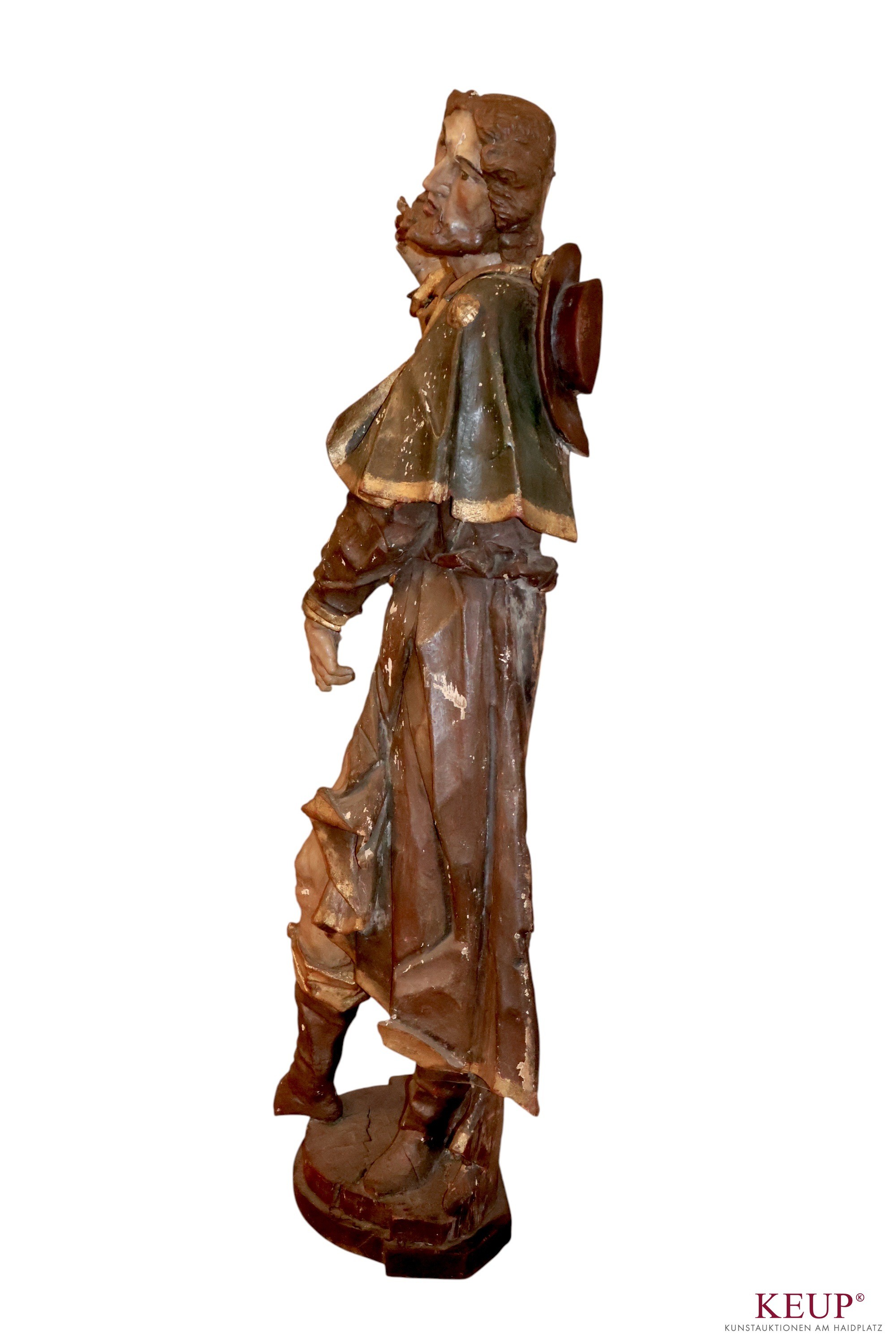 Große Skulptur - wohl Alpenraum 18.Jahrhundert ''Hl. Rochus'', Holz geschnitzt und gefasst, braune Manteldraperie mit blau-goldenem Umhang mit Muscheln besetzt, Pilgerhut, Pilgerflasche, Wundmal am rechten Oberschenkel, braune Stiefel mit goldener Stulpe, zwei Drittel rückseitig gehöhlt, braunes lockiges Haar, offener Mund, Höhe ca. 178 cm, ca. 49,4 kg, Altersspuren (Fassungsschäden, 8 fehlende Finger, fehlender rechter Vorfuß), Provenienz: Regensburg