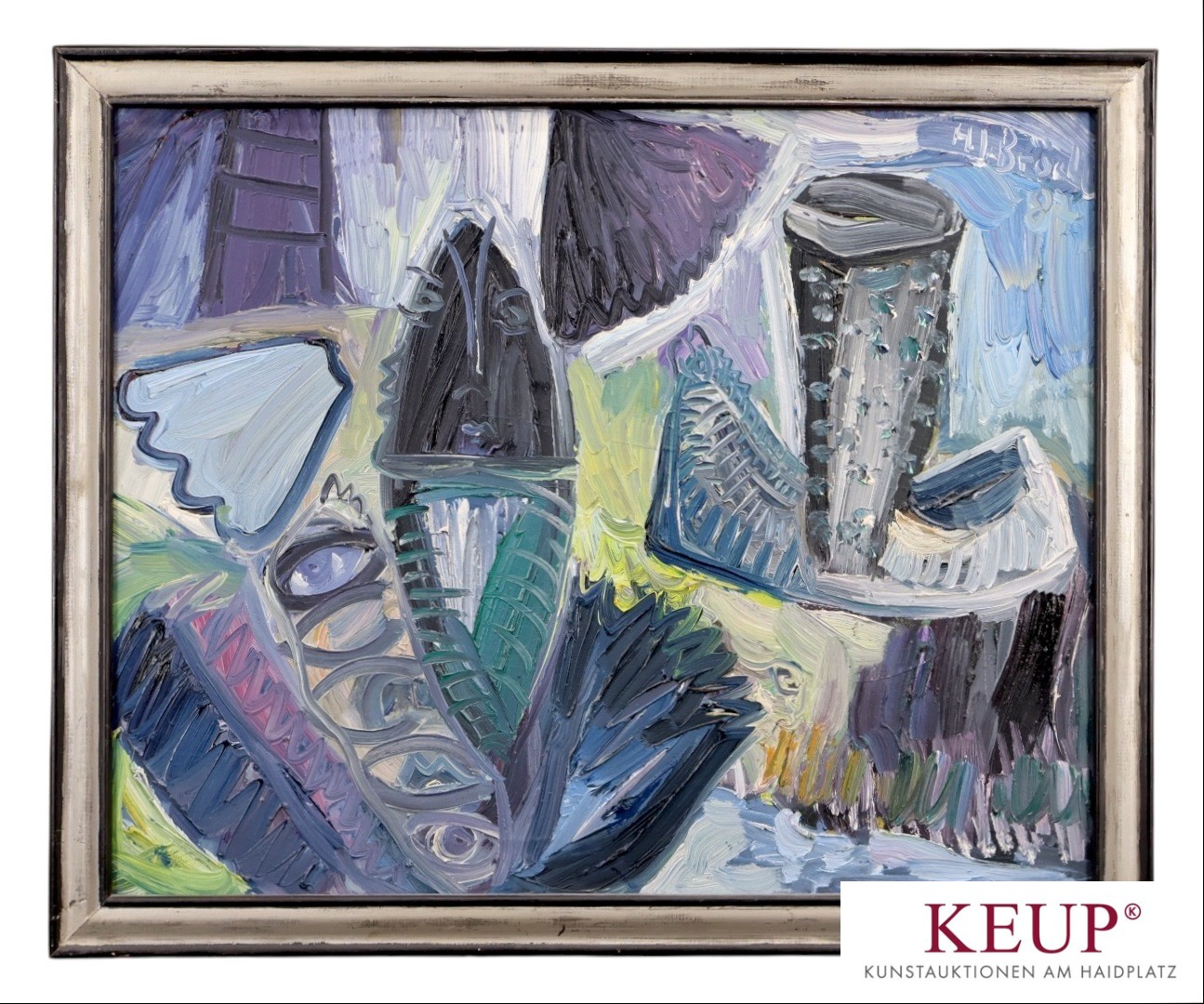 Gemälde - Hans Jürgen Bröckl (1956 Flossenbürg in der Oberpfalz) ''Ohne Titel'', signiert, datiert 87, Öl auf Leinwand, Maße Darstellung ca. 40X50 cm, Rahmen, Provenienz: Private Kunstsammlung Oberpfalz, vgl. Lit.www.broeckl-art.com: 1979-1984 Studium der Malerei und Graphik an der Kunsthochschule Kassel bei den Prof. Kurt Hauck, Manfred Bluth und Nickl; seit 1984 freischaffender Künstler in seiner Heimatgemeinde Flossenbürg, Gruppenausstellungen: 1981 Kunstverein Kassel,1983''Junger Westen'' Recklinghausen 1984 Haus der Kunst München,1987Aktionsraum Sandershäuser-Straße Kassel,1990 Diözesanmuseum Regensburg 1992 Runtingerhaus Regensburg,1993 Diözesanmuseum Regensburg, Einzelausstellungen: 1983 Galerie Hammer Weiden 1985 Kunstraum Hafens-Straße Kassel, 1987 Galerie Ulrich Berr Weiden,1988 Aktionsraum Sandershäuser-Straße Kassel 1991/92/93 Galerie Albrecht Regensburg,1997 Raiffeisenbank Flossenbürg, 2000 Krankenhaus Burglengenfeld, 2002 Kunstverein Weiden, 2008 Atelier & Galerie Dinnes St. Johann - Pfatter, 2019 fairKULTURcafé e.V. Neumarkt/Opf..