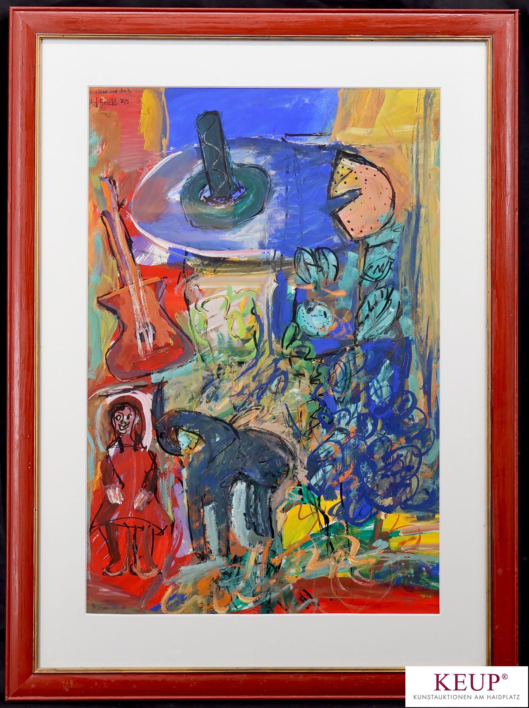 Gemälde - Hans Jürgen Bröckl (1956 Flossenbürg in der Oberpfalz) ''Einhorn und Anitaf, signiert, datiert 13, auf Papier, Maße Darstellung ca. 59x39 cm, Rahmen, Gesamtmaße ca. 76x56 cm, Provenienz: Private Kunstsammlung Oberpfalz, vgl. Lit.www.broeckl-art.com: 1979-1984 Studium der Malerei und Graphik an der Kunsthochschule Kassel bei den Prof. Kurt Hauck, Manfred Bluth und Nickl; seit 1984 freischaffender Künstler in seiner Heimatgemeinde Flossenbürg, Gruppenausstellungen: 1981 Kunstverein Kassel,1983''Junger Westen'' Recklinghausen 1984 Haus der Kunst München,1987Aktionsraum Sandershäuser-Straße Kassel,1990 Diözesanmuseum Regensburg 1992 Runtingerhaus Regensburg,1993 Diözesanmuseum Regensburg, Einzelausstellungen: 1983 Galerie Hammer Weiden 1985 Kunstraum Hafens-Straße Kassel, 1987 Galerie Ulrich Berr Weiden,1988 Aktionsraum Sandershäuser-Straße Kassel 1991/92/93 Galerie Albrecht Regensburg,1997 Raiffeisenbank Flossenbürg, 2000 Krankenhaus Burglengenfeld, 2002 Kunstverein Weiden, 2008 Atelier & Galerie Dinnes St. Johann - Pfatter, 2019 fairKULTURcafé e.V. Neumarkt/Opf..