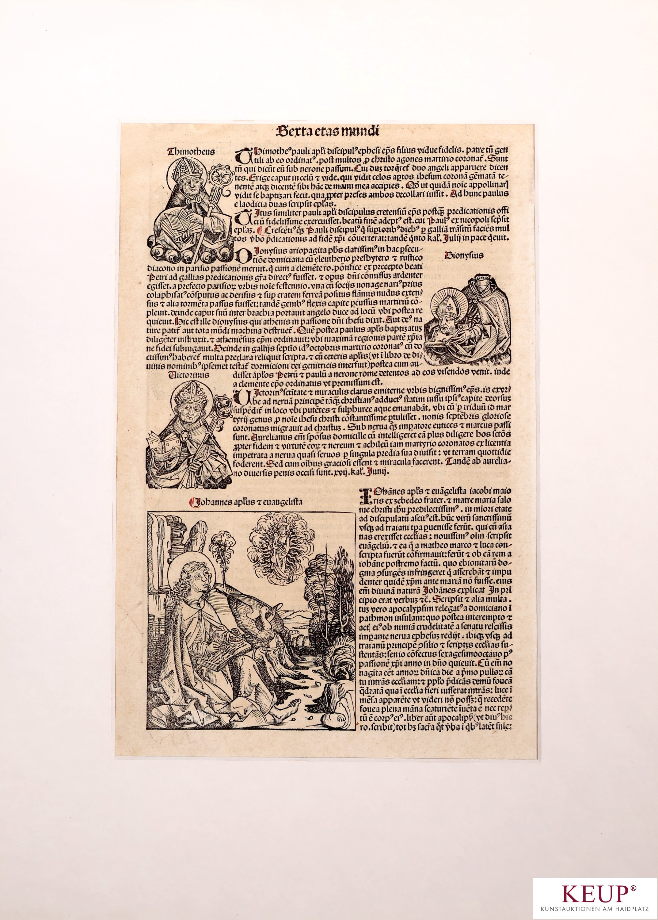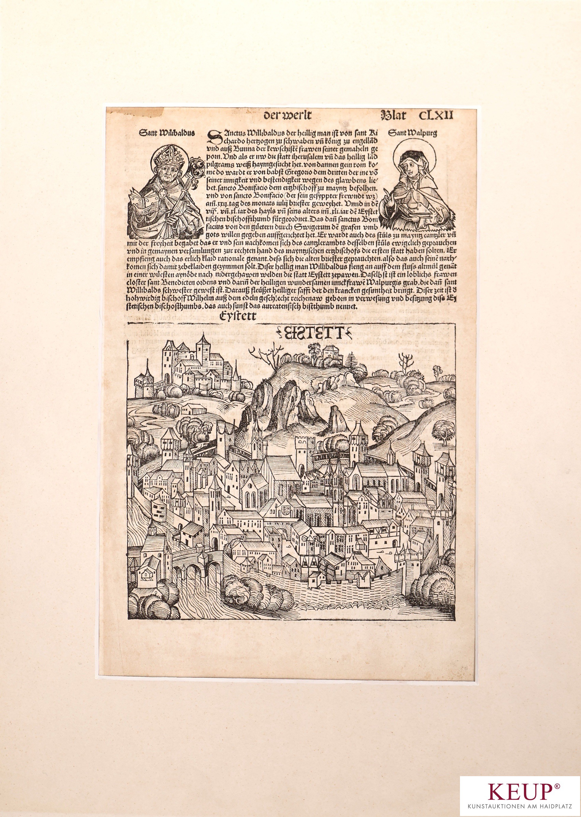 Holzschnitt - 16.Jahrhundert ''Eichstätt mit Willibald und Walburga'', aus der Schedelschen Weltchronik (erstmals 1493 in Nürnberg veröffentlicht), deutsche Ausgabe, Blattmaße ca. 42,5x28,5 cm, anbei: ''Etas mundi'', Provenienz: Nürnberg