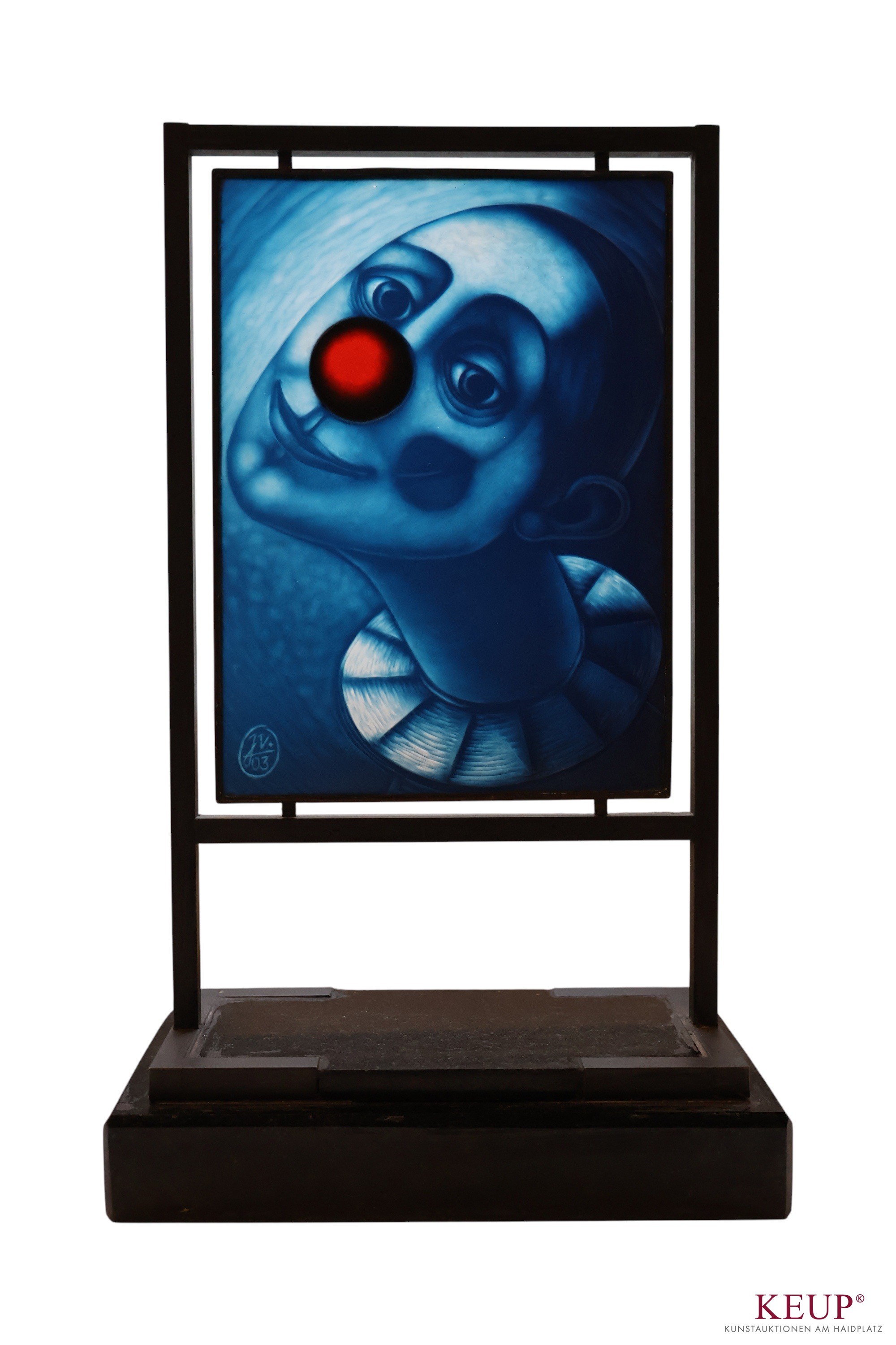 Glasobjekt - Jaroslava VOTRUBOVA (1951 Cheb) ''Clown'', im Glas monogrammiert und datiert 03, blau, im Stil einer Lithophanie, Metallständer, Maße ca. 33x20x10,5 cm, Provenienz: Private Kunstsammlung Oberpfalz, vgl. Lit.: 1970- 1972 Fachschule der Bildenden Künste in Prag, 1973 -1979 Akademie für Angewandte Kunst in Prag (Prof. St. Libenský), 1972 -1988 - Designertätigkeit bei den Kavalier Glaswerken in Sázava, 1988 - 2007 - freischaffende Künstlerin, 2007 - 2017 Lehrer für die Förderung der Kunst - Fachschule in Prag, Seit 2017 unterrichtet Kunst und Kunstgeschichte bei SPSS Panská in Prague,