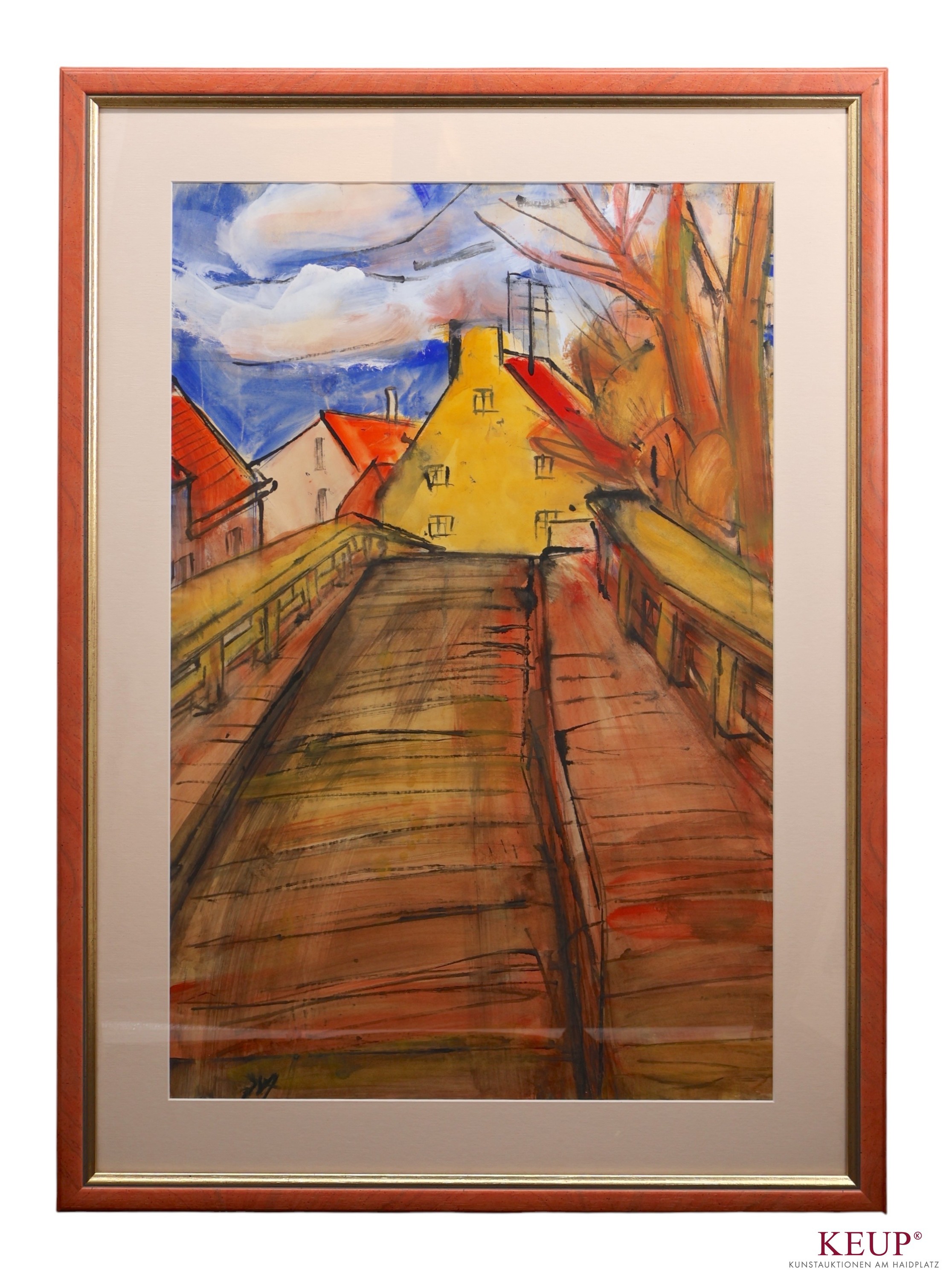 Aquarell - Josef Georg Miller (1905 Augsburg - 1983 Kallmünz) ''Straßenzug bei Kallmünz'', monogrammiert M, lasierende Farben auf Papier, Maße Darstellung ca. 78x51 cm, Provenienz: Privatsammlung Oberpfalz, Rahmen, Gesamtmaße ca. 98x59 cm, vgl. Lit.: Studium in Leipzig (Prof. Soltmann) und Stuttgart (Prof. Altherr, Prof. Spiegel), ab 1941 Keramikstudium an der Akademie für angewandte Künste in München, 3 Bilder wurden in der Zeit des Nationalsozialismus aus dem Museum der bildenden Künste in Leipzig entfernt, ab 1946 Mitglied im Berufsverband der Bildenden Künstler Regensburg,