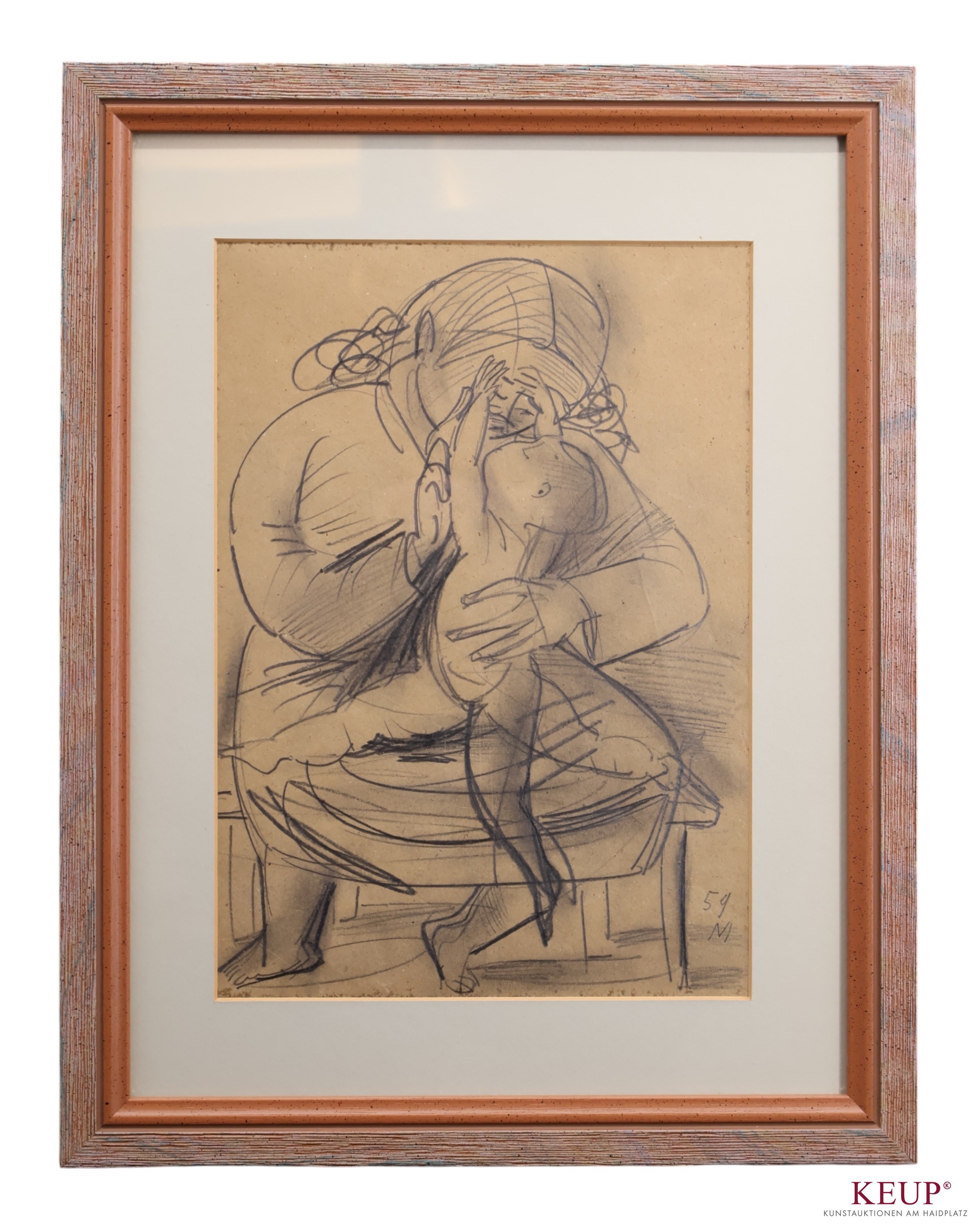 Zeichnung - Josef Georg Miller (1905 Augsburg - 1983 Kallmünz) ''Mutter mit Kind'', monogrammiert M, datiert (19)59, Bleistift auf Papier, Maße Darstellung ca.31x21,5 cm, Provenienz: Privatsammlung Oberpfalz, vgl. Lit.: Studium in Leipzig (Prof. Soltmann) und Stuttgart (Prof. Altherr, Prof. Spiegel), ab 1941 Keramikstudium an der Akademie für angewandte Künste in München, 3 Bilder wurden in der Zeit des Nationalsozialismus aus dem Museum der bildenden Künste in Leipzig entfernt, ab 1946 Mitglied im Berufsverband der Bildenden Künstler Regensburg,
