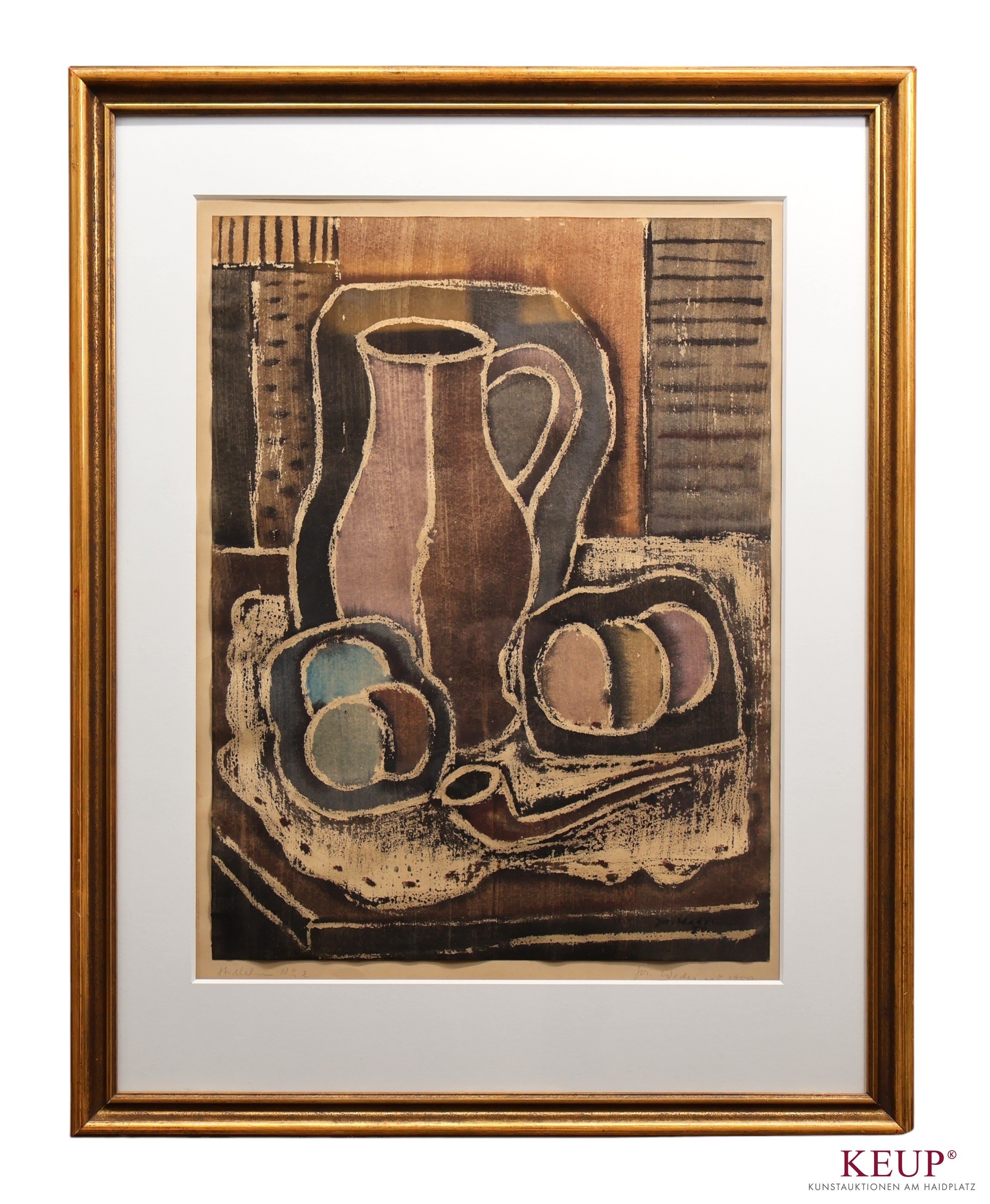Gouache - Josef WEDEWER (1896 Lüdinghausen 1979) ''Stillleben mit Krug, Obst und Pfeife'', signiert, datiert 50, auf Papier, Maße Darstellung ca. 47,5x35,5 cm, Rahmen, Gesamtmaße ca. 69x54 cm, Provenienz: Regensburg, vgl Lit.: deutscher Maler; 1919-1923 Studium an der Kunstakademie Kassel bei Curt Witte und Ewald Düllberg; Mitbegründer der Gruppe ''Junges Westfalen'', Mitglied des Westdeutschen Künstlerbundes und Mitglied der ''Dortmunder Gruppe''; zahlreiche Ausstellungen und Werke in öffentlichem Besitz