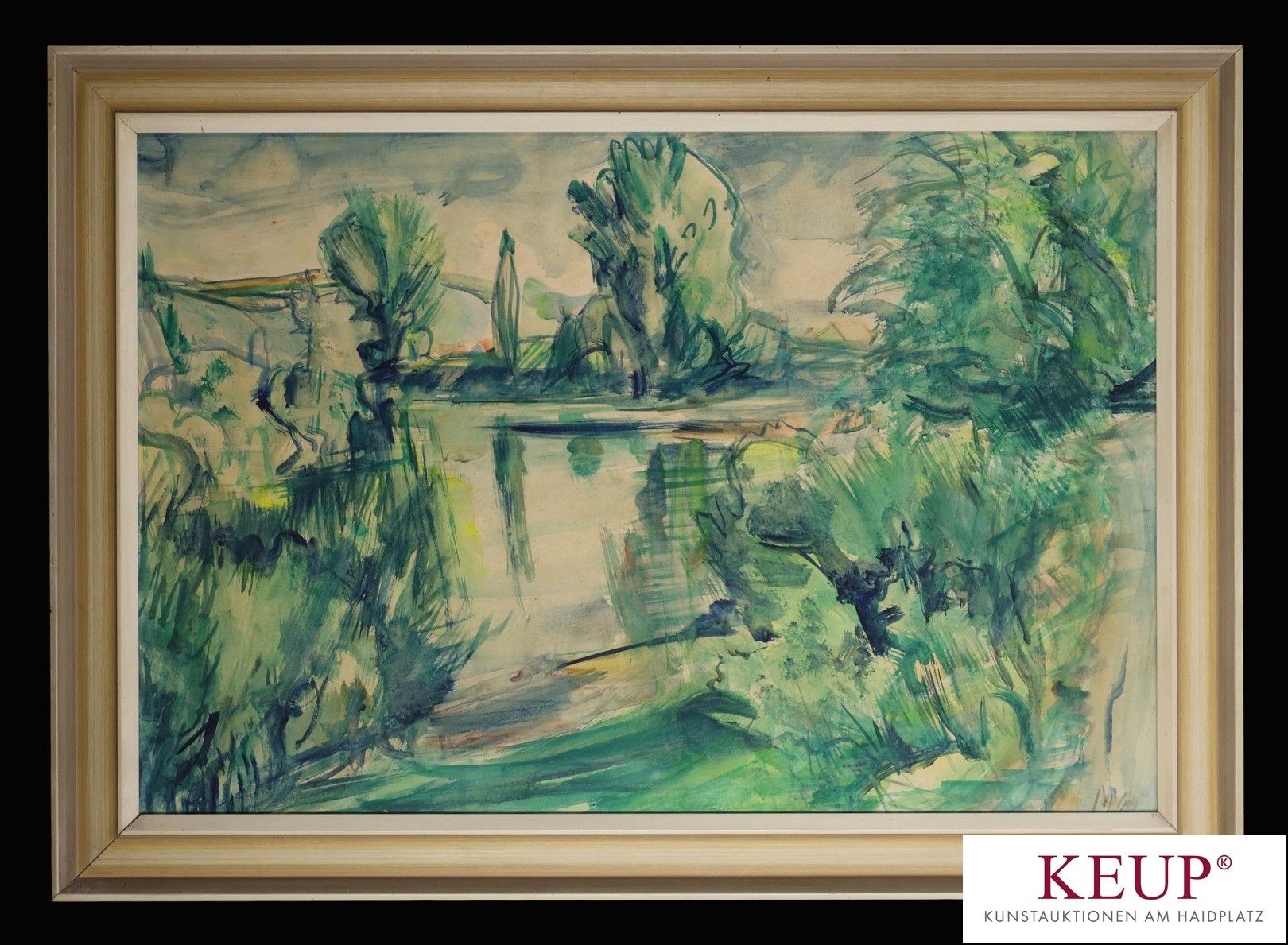 Aquarell - Josef Georg Miller (1905 Augsburg - 1983 Kallmünz) ''Landschaft bei Kallmünz'', r.u. monogrammiert M, datiert (19)65, lasierende Farben auf Papier, Maße Darstellung ca. 50x75 cm, Rahmen, Provenienz: Privatsammlung Oberpfalz, vgl. Lit.: Studium in Leipzig (Prof. Soltmann) und Stuttgart (Prof. Altherr, Prof. Spiegel), ab 1941 Keramikstudium an der Akademie für angewandte Künste in München, 3 Bilder wurden in der Zeit des Nationalsozialismus aus dem Museum der bildenden Künste in Leipzig entfernt, ab 1946 Mitglied im Berufsverband der Bildenden Künstler Regensburg,