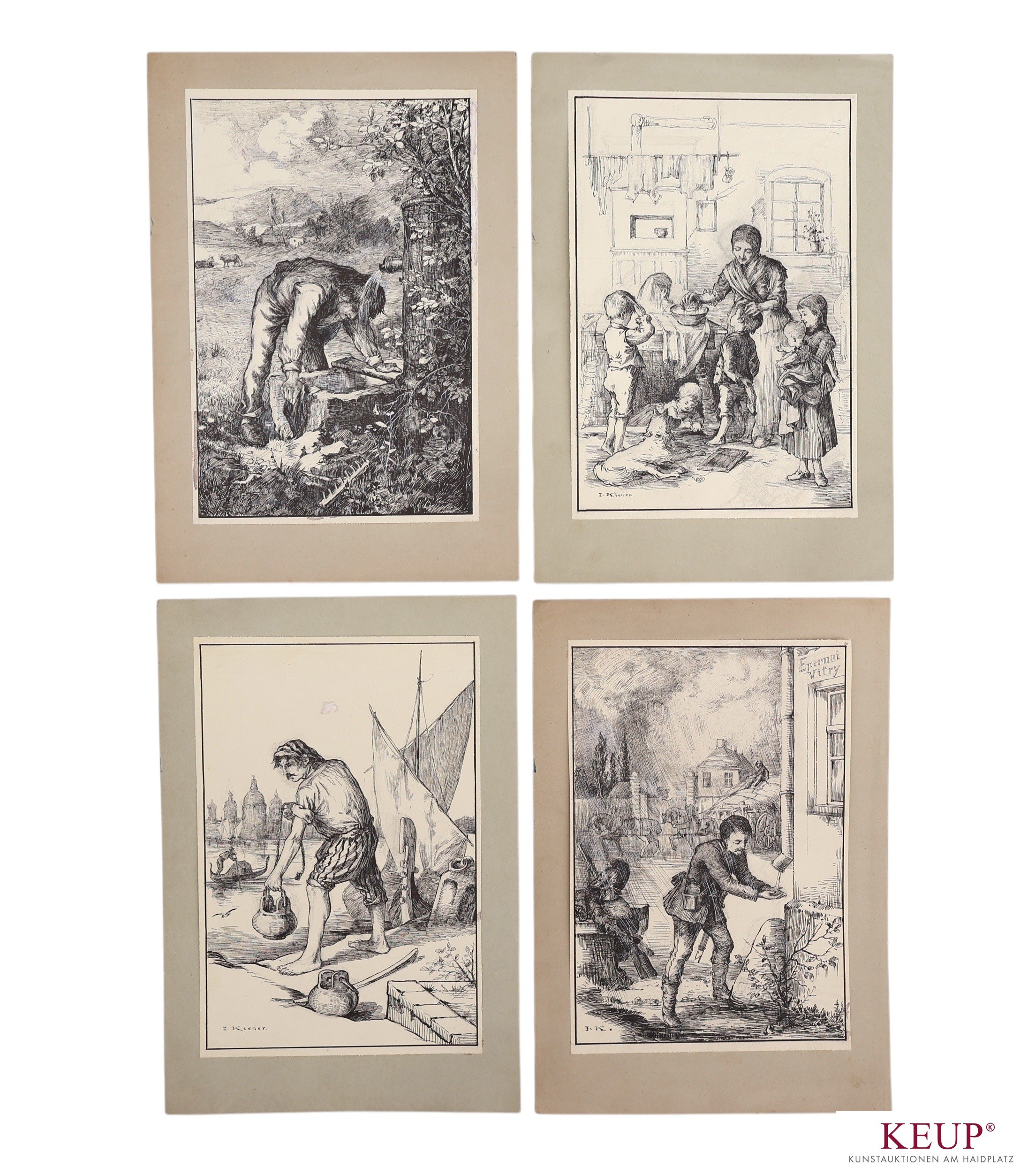 Lot Zeichnung - Joseph KIENER (1856 Schwarzenfeld in der Oberpfalz -1918 Eichstätt) ''verschiedene Szenen aus dem Alltag mit Soldat, Fischer, Bauer und Mutter'', teilweise signiert und monogrammiert, Tusche auf Papier, Maße Darstellung ca. 22x15 cm, 4 Stück, Provenienz: Regensburg, vgl Lit.: an der Präparandenschule in Regensburg, ab 1875 Lehrerseminar in Eichstätt; Illustrator bei Ludwig Auer in Donauwörth; Königlicher Gymnasialprofessor; 1918 ''Kienerausstellung'' in der ehem. fürstbischöflichen Sommerresidenz Eichstätt;