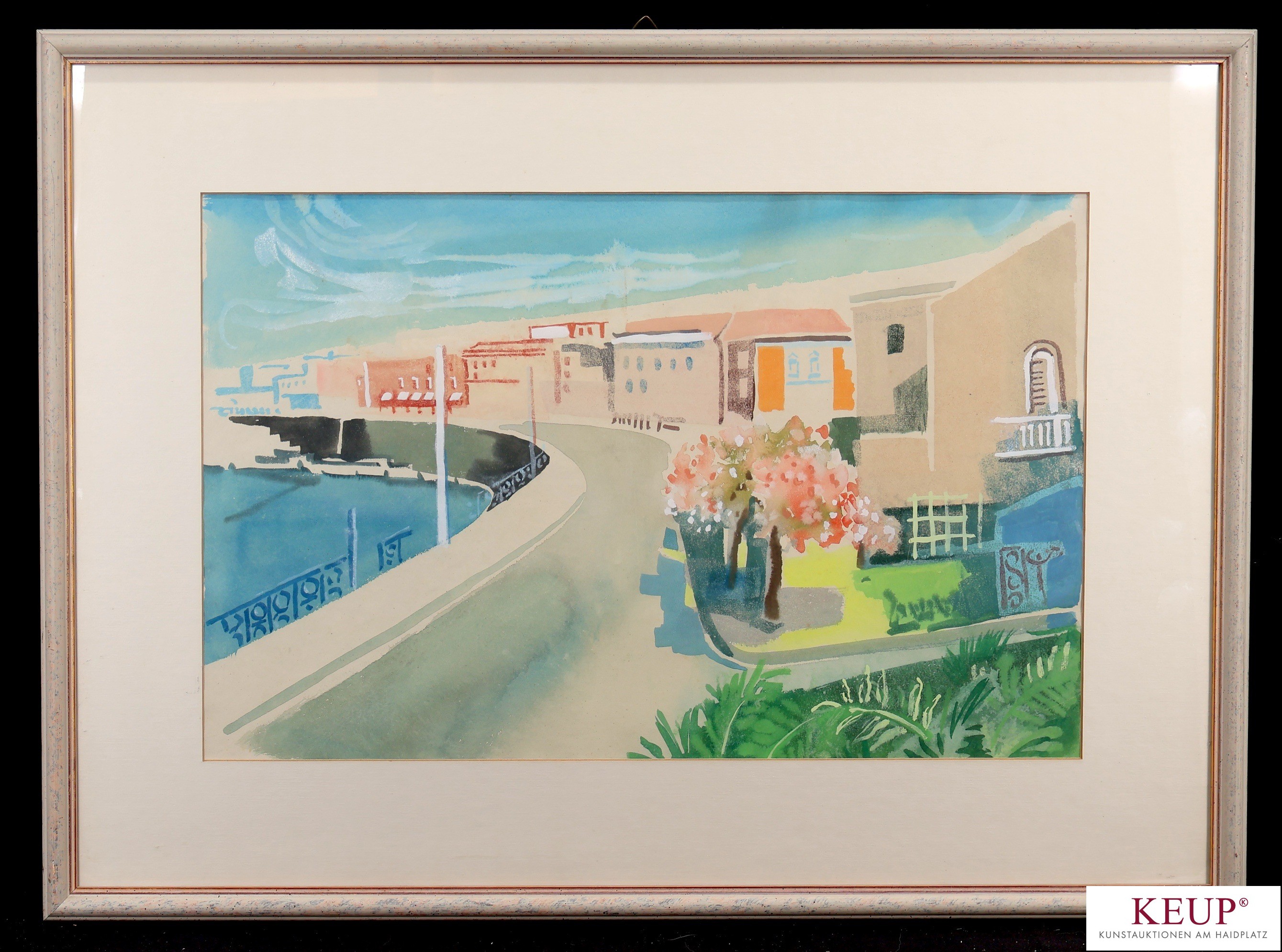 Aquarell - Karl Haberl (1920 Nürnberg) ''Südliche Küstenstadt'', unsigniert, lasierende Farben auf Papier, Maße Darstellung ca. 37x57 cm, Passepartout, Rahmen, Gesamtmaße ca. 58x78 cm, Provenienz: Privatbesitz Regensburg, vgl. Lit. Internet: Studium an der Akademie der bildenden Künste in München, hier später Professor, bekannt für Städteansichten und Seemotive aus dem Oberbayerischen, vertreten in der Sammlung Lenbachhaus München,