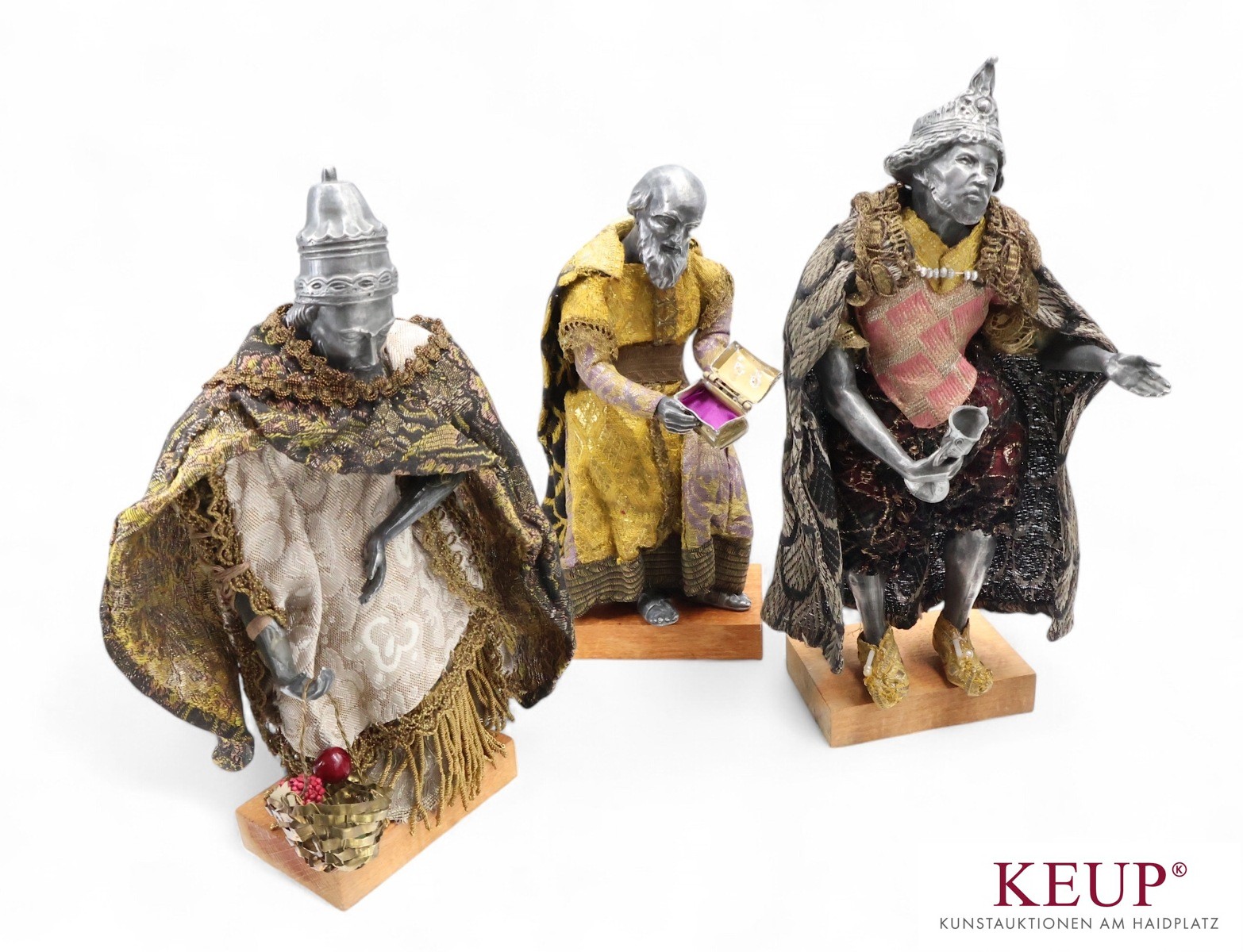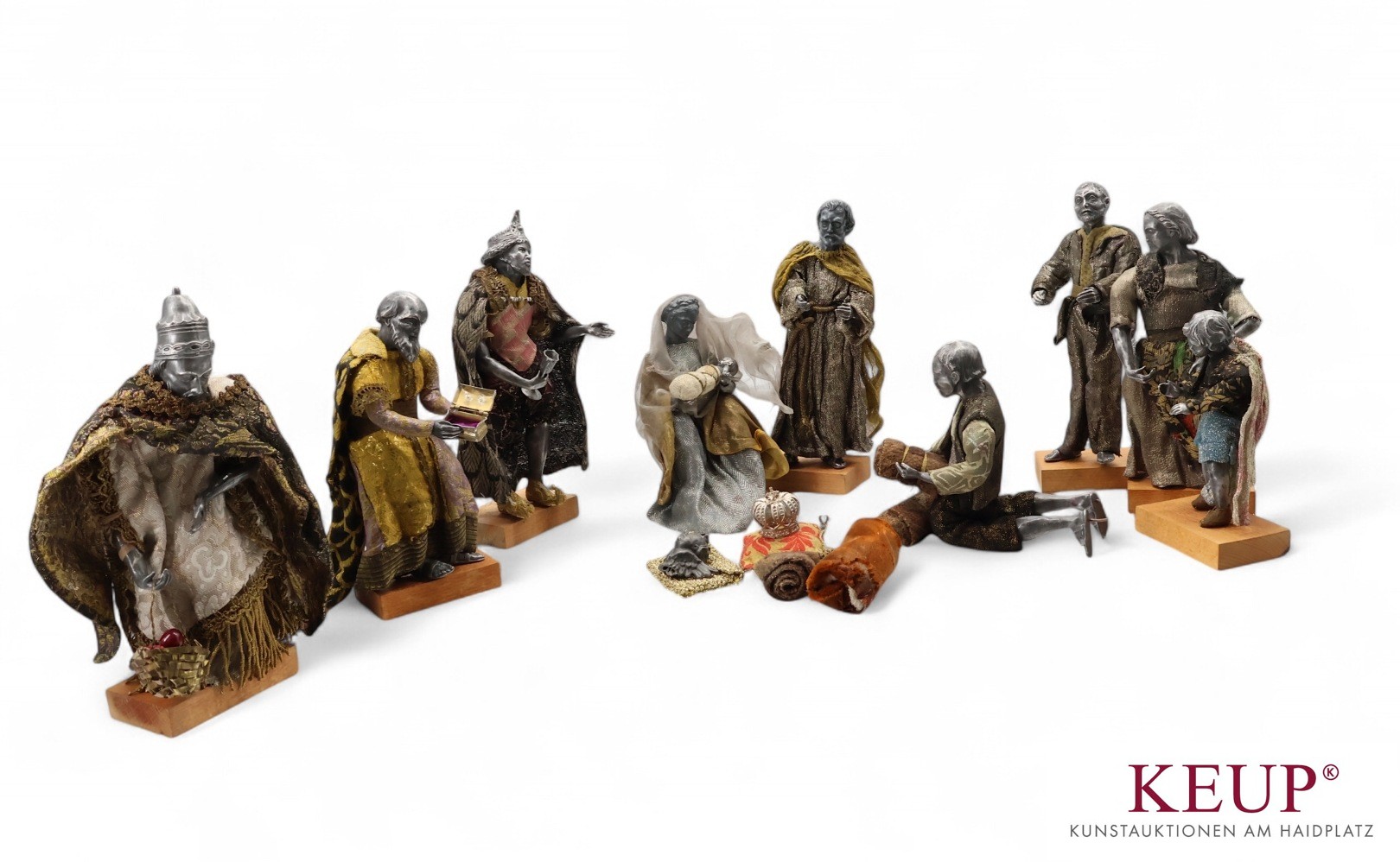 Krippenfiguren - wohl deutsch 19./20.Jahrhundert Gliedmaßen und Köpfe aus Zinn, bekleidet, Höhe ca. 9 bis 25 cm, 9 Stück, Holzsockel später ergänzt, Provenienz: Privatbesitz Regensburg