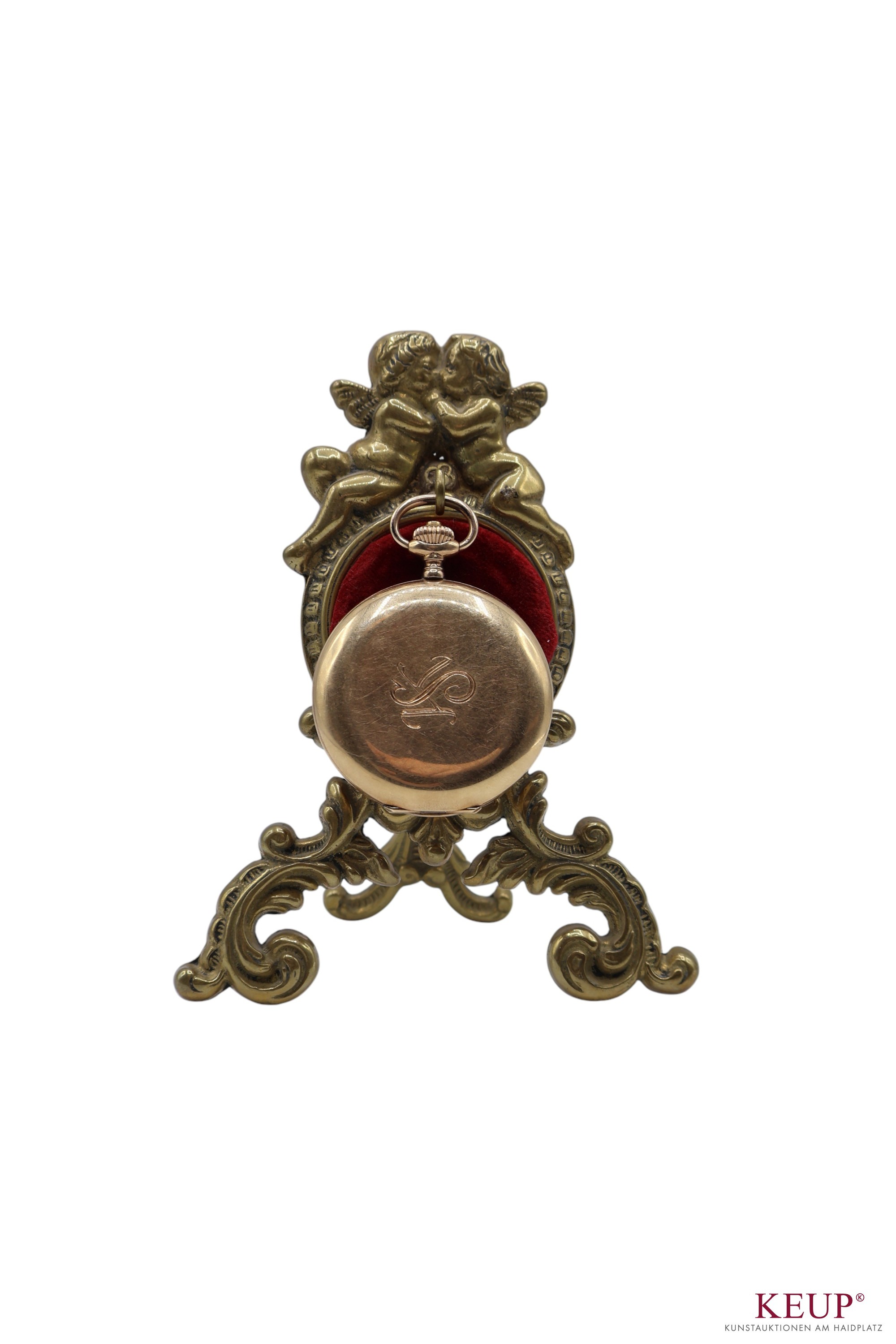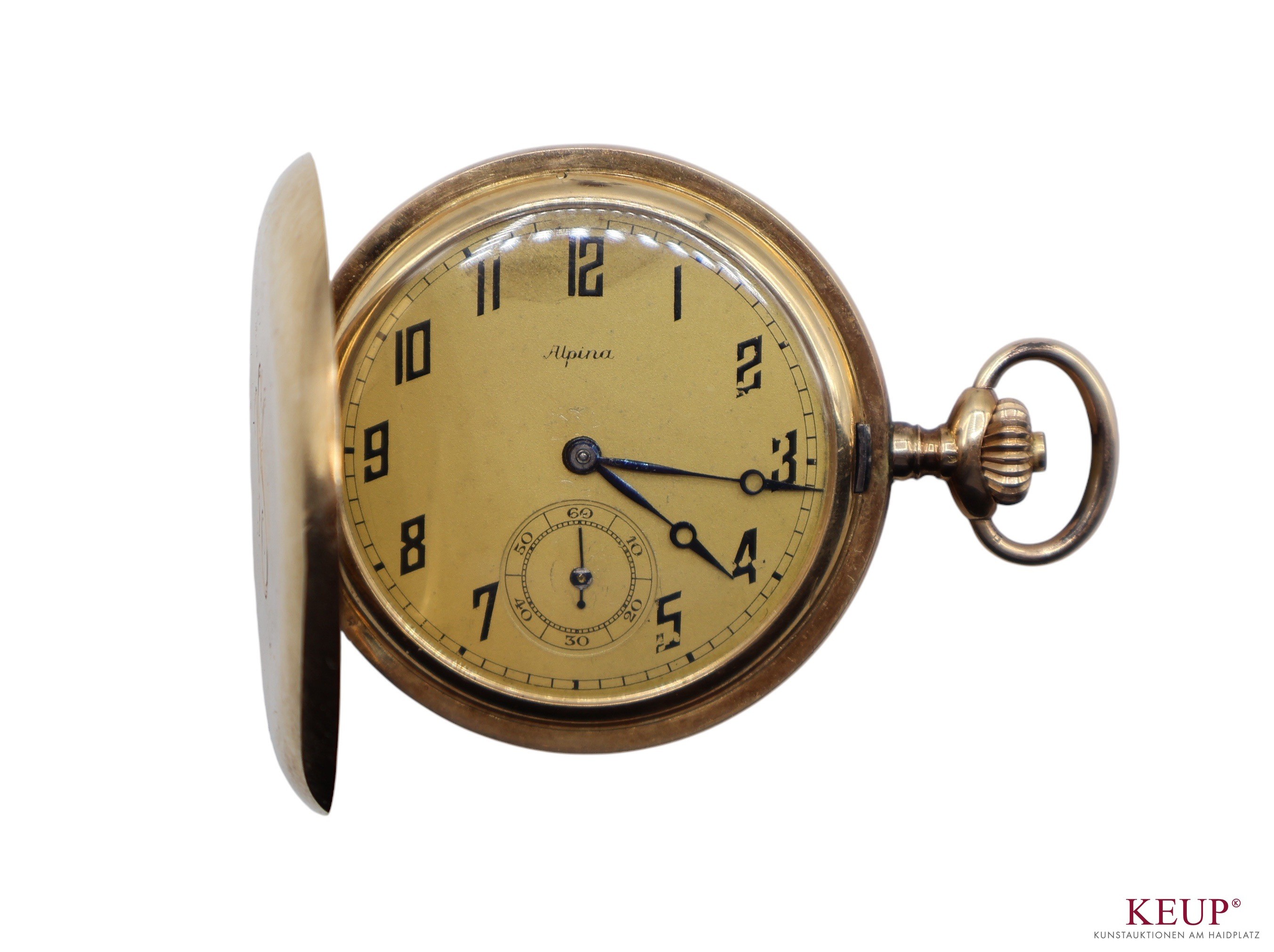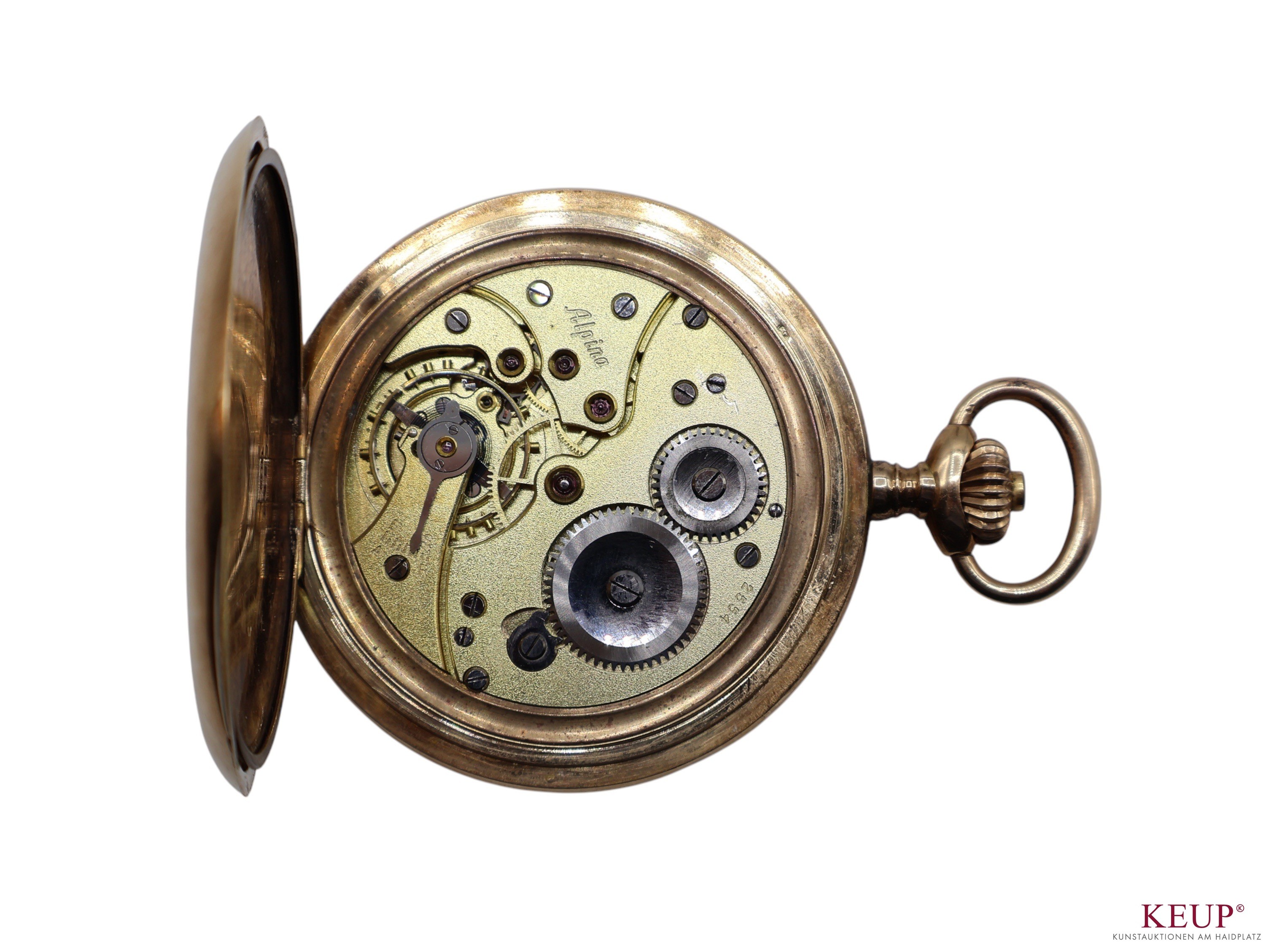 Goldene Taschenuhr - Marke Alpina Gold gest. 14 K/585, Nr. 24292, 2 Deckel Gold, Mon.SK, goldfarbenes Zifferblatt mit arabischen Zahlen, gebl. Zeiger, kl. Sekunde, mechanisches Werk mit Kompensationsunruhe und 3/4 Platine, Kronenaufzug bei 3, d= ca. 50 mm, anbei Kerzenständer, Messing, verziert mit Putti, Höhe ca. 15 cm, ca. 90 Gramm, Uhren werden nicht auf Gangbarkeit geprüft, Provenienz: Regensburg