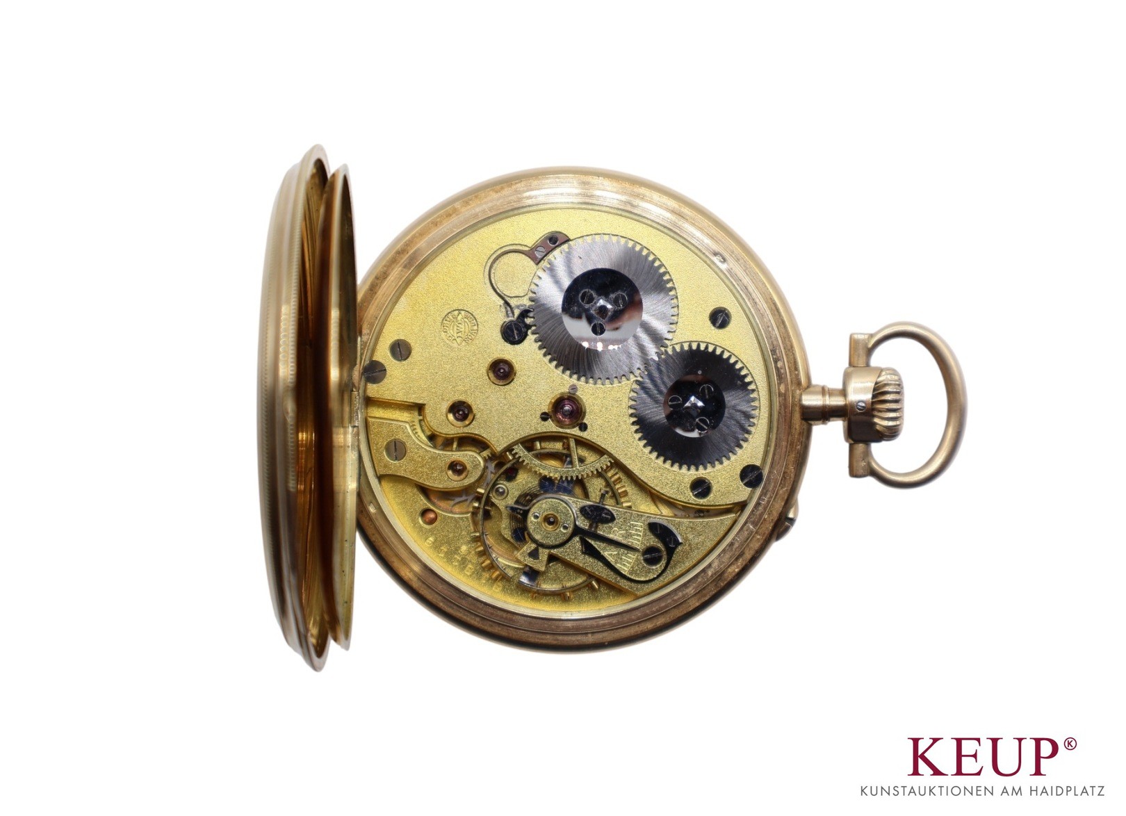 Offene Taschenuhr - Marke International Watch Co. Schaffhausen Reichsgoldstempel, Schweizer Kontrollstempel mit Eichhörnchen, Gold gest. 585, Gehäusenummer 854065, Zifferblatt mit arabischen Zahlen, gebläute Zeiger, kleine Sekunde, Werk num. 818119 H6 und gemarkt ''Probus IWC Scafusia'', vergoldetes Brückenwerk mit Breguetspirale, d.= ca. 50 mm. Uhr läuft, Provenienz: Privatbesitz Landkreis Regensburg
