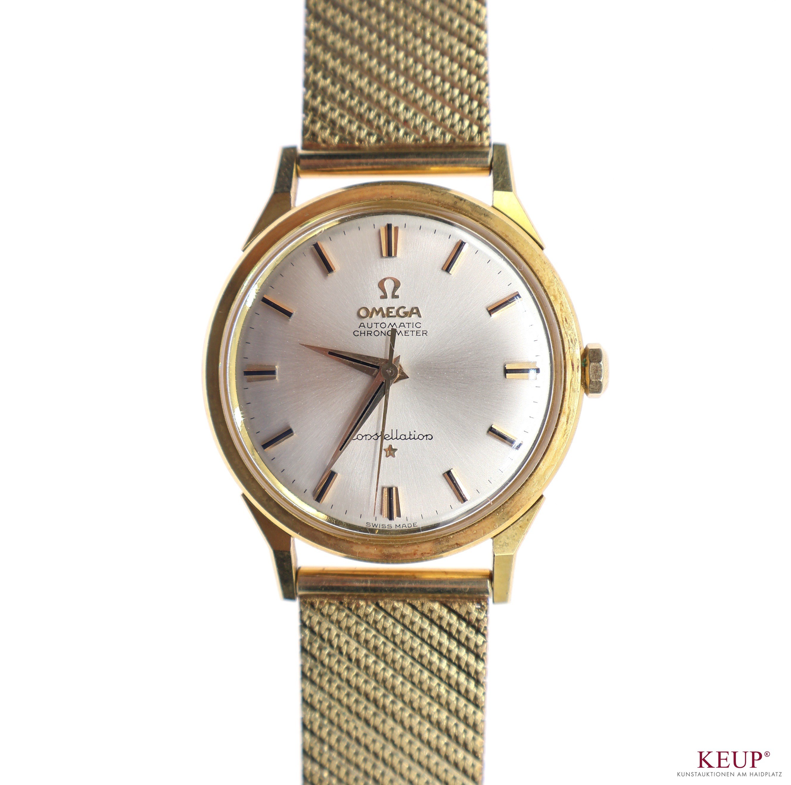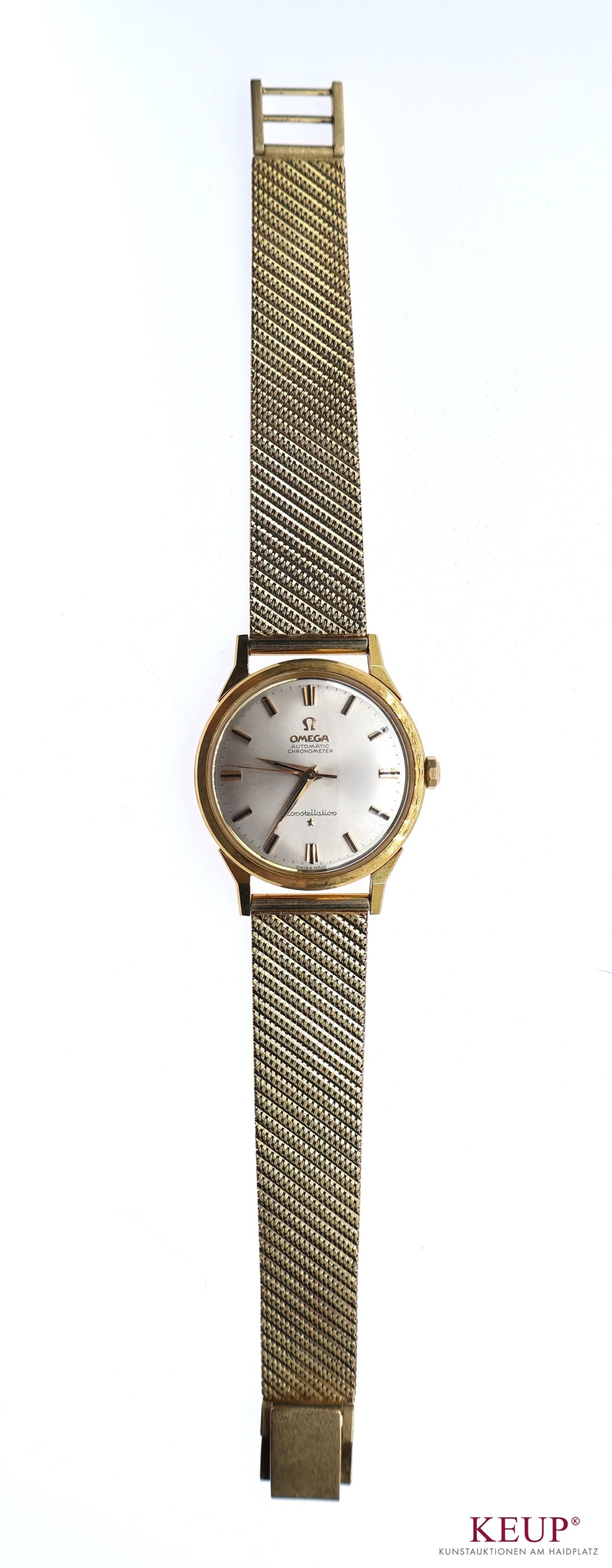 Goldene Herrenarmbanduhr - Marke Omega Constellation Automatic, Chronometer, Goldgehäuse gemarkt, verschraubter Boden, anbei Präzisions-Zeugnis mit Werknummer 19378533 (1962), Stabindexe, Zentralsekunde, Goldarmband gest. 585, anbei Schatulle mit Gebrauchsspuren, Uhren werden nicht auf Gangbarkeit geprüft (Kurzzeittest Uhr läuft an), Provenienz: Privatbesitz Chiemgau