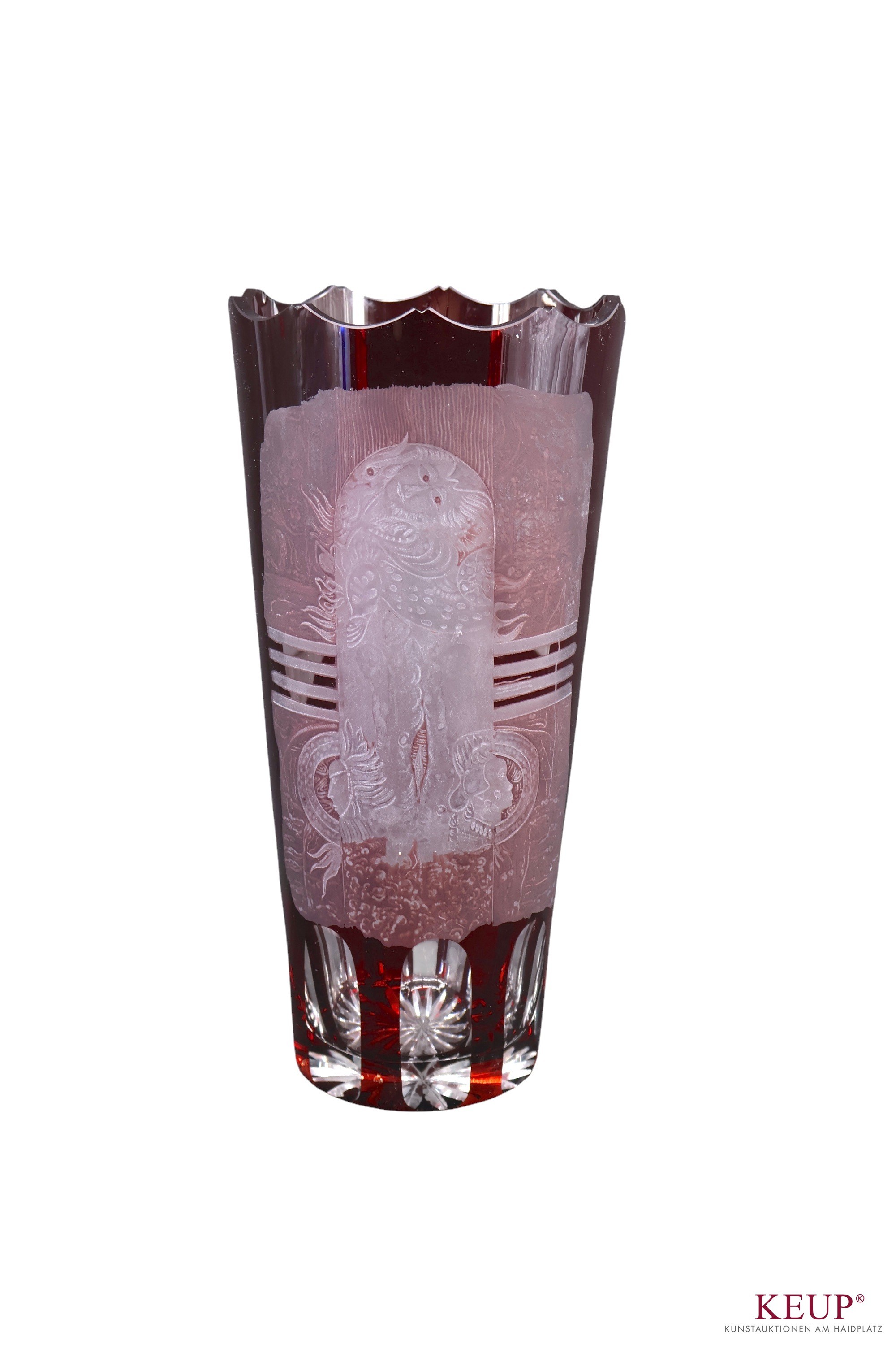 Vase - Monogrammist GL (XX.Jahrhundert) Glas mit rubinrotem Überfang, geschnitten und geätzt, Dekor des phantastischen Realismus, Höhe ca. 31,5 cm, Provenienz: Privatbesitz Niederbayern