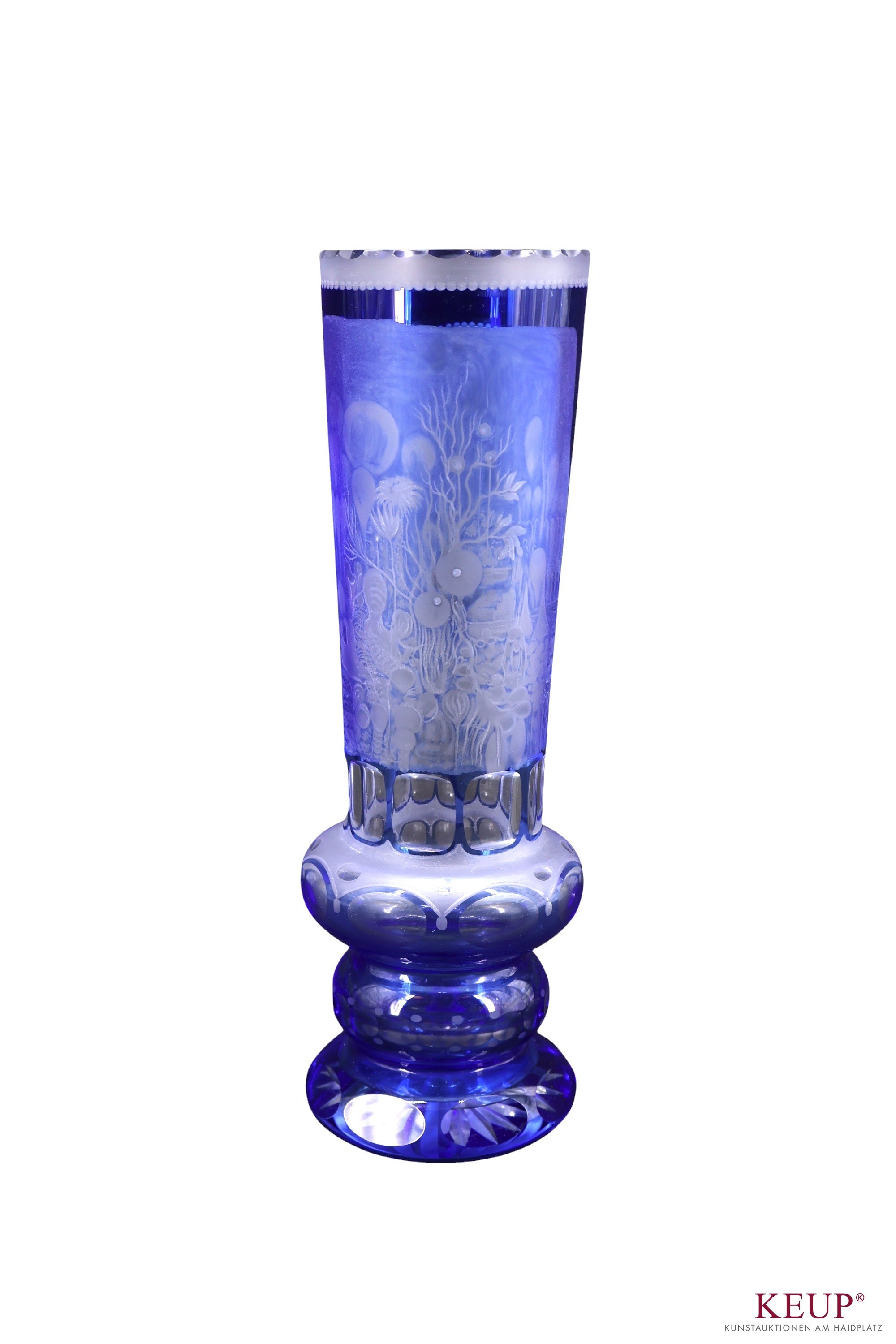 Vase - Monogrammist GL (XX.Jahrhundert) Glas mit blauem Überfang, geschnitten und geätzt, Dekor des phantastischen Realismus, Höhe ca. 29 cm, Provenienz: Privatbesitz Niederbayern