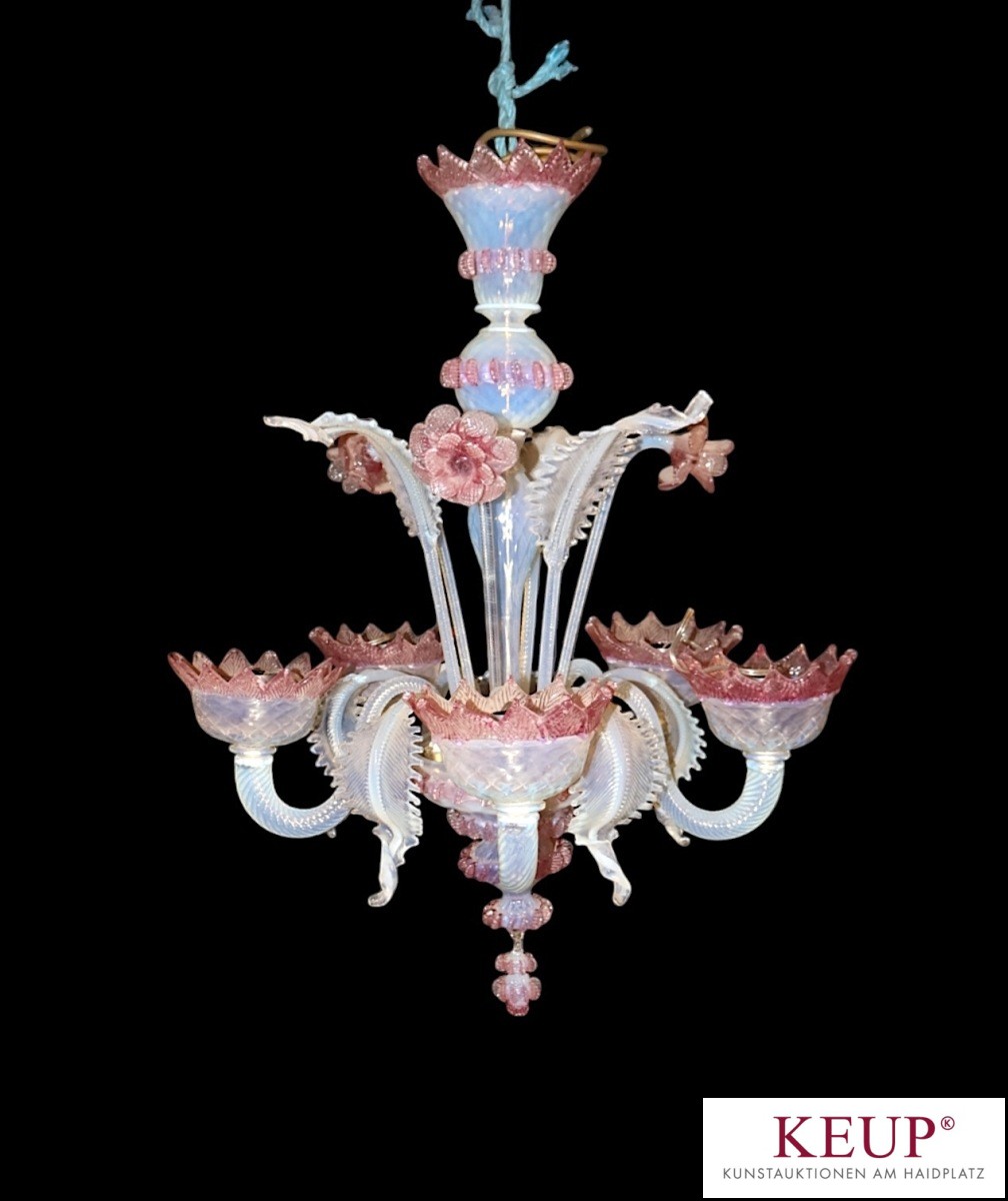 Deckenleuchter - Murano Italien 20.Jahrhundert lüstrierendes Glas, gegliederter Balusterschaft, 5-armig, verziert mit Blüten- und Blattwerk, d.= ca.60 cm, Elektrik (Kabel neu gezogen, aber nicht angeschlossen), Provenienz: Privatbesitz Kelheim