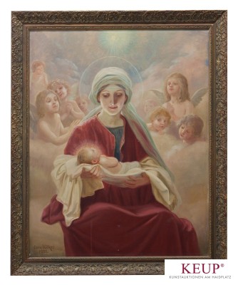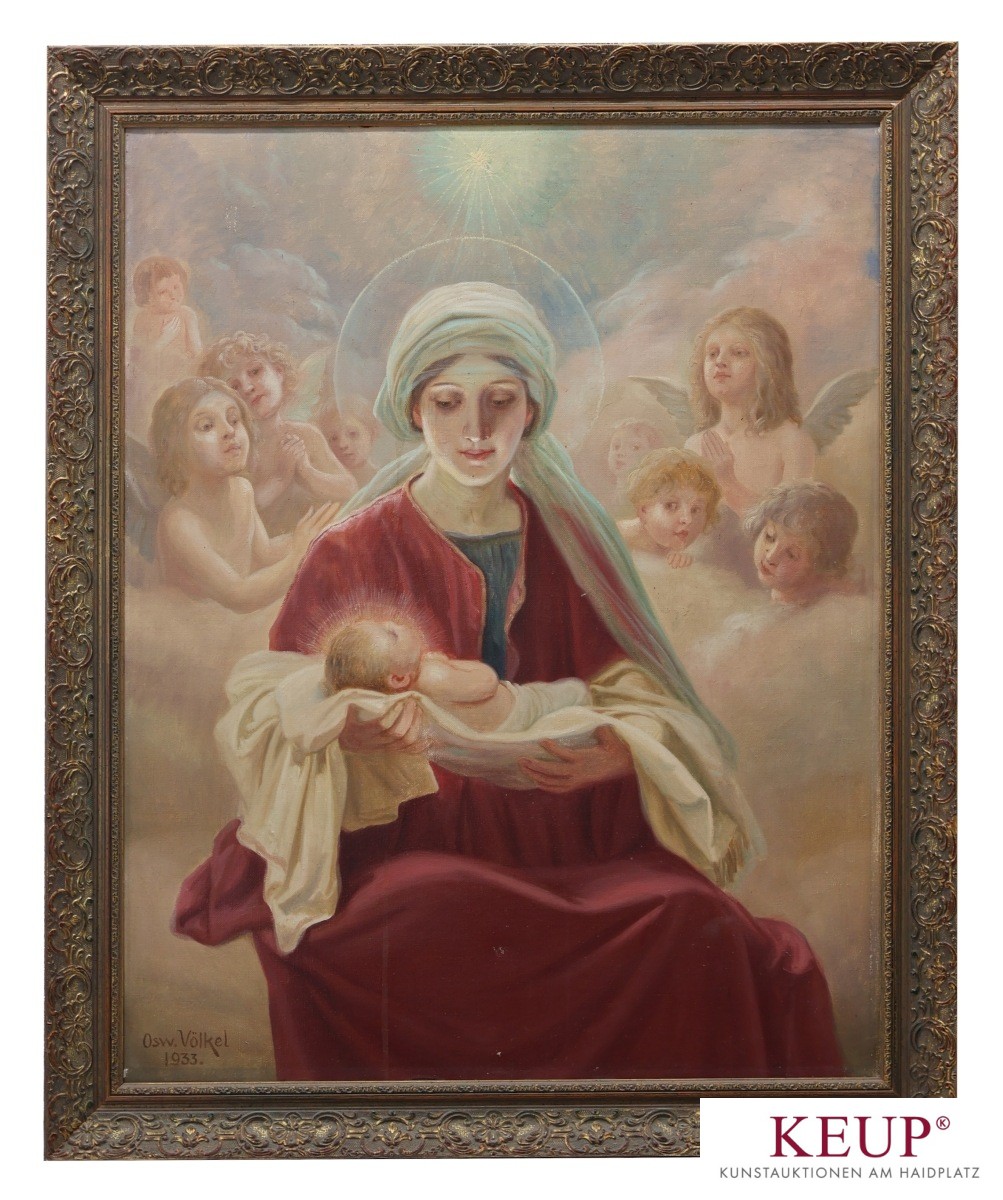 Gemälde - Oswald VÖLKEL (1873 Schlegel/Neurode - 1952 Gräfelfing) ''Maria mit Kind, flankiert von Engeln'', l.u. signiert, datiert 1933, Öl auf Leinwand, Maße Darstellung ca. 75x60 cm, Goldrahmen, Gesamtmaße ca. 87x71 cm, Provenienz: Privatsammlung Regensburg, vgl. Lit.: Besuch der Königlichen Kunstgewerbeschule in München; 1904 Atelier in München;