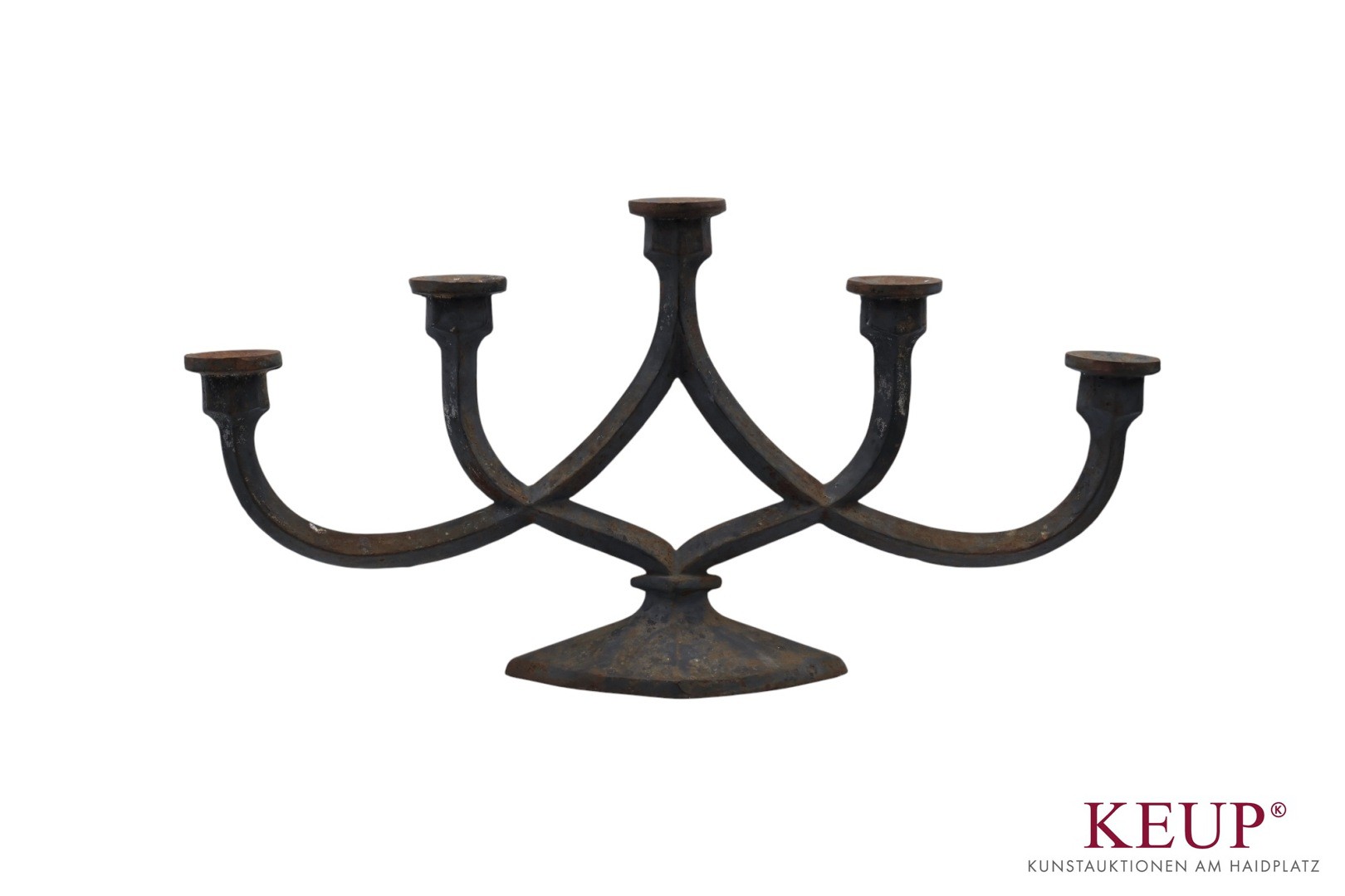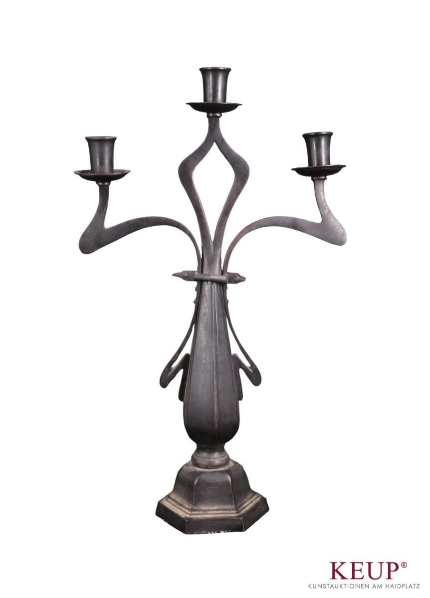 Paar Kerzenhalter - wohl Skandinavien 20.Jahrhundert Bronze und Eisenguss, drei- und fünfflammig, Altersspuren, Höhe ca. 24 bis 51 cm, ca. 5,6 kg, Provenienz:Privatbesitz Oberbayern