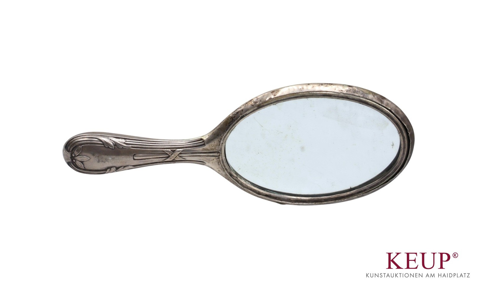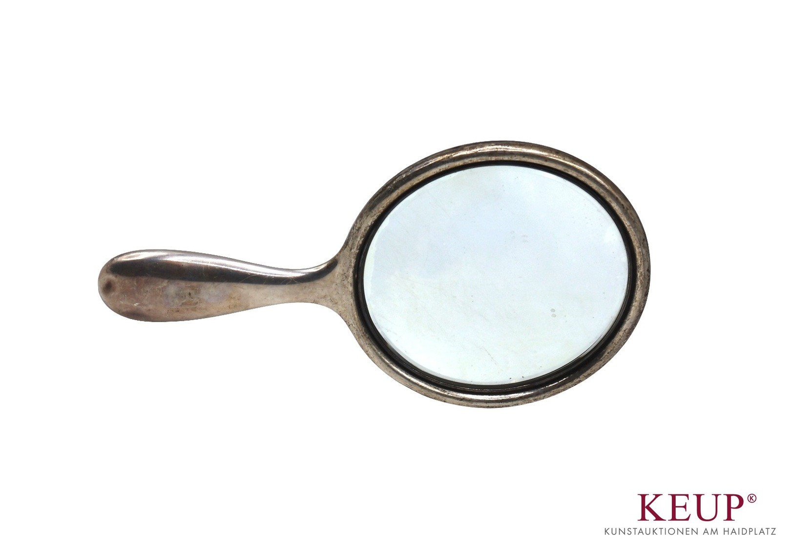 Paar Handspiegel - deutsch und England nach 1900 Silber gest. 800 und Sterling, 1x Perlranddekor mit graviertem Monogramm, 1x verziert mit Blattwerk, Alters- und Gebrauchsspuren, Länge 24 bis 27 cm, 2 Stück, Provenienz: Privatbesitz Oberbayern