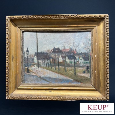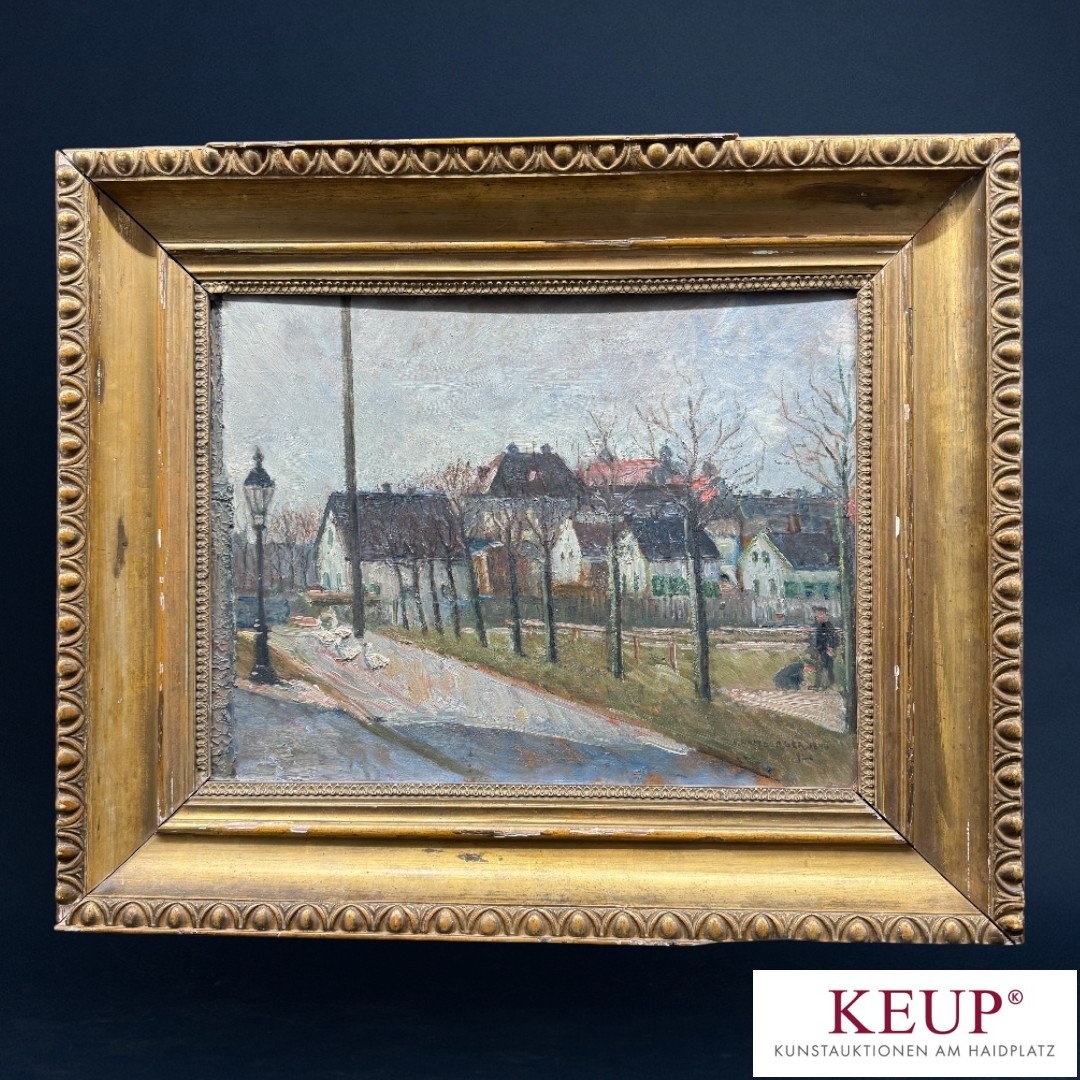 Gemälde - Pauline Bamberger Jehu (1867 Heidelberg - 1947 Albany New York) ''Allee mit Straßenlaterne und Tierstaffage'', r.u. signiert, datiert 1920, Öl auf Leinwand, Maße Darstellung ca. 34x44 cm, Goldrahmen, Gesamtmaße ca. 52x63 cm, Provenienz: Privatbesitz Oberpfalz, vgl. Quelle Internet: erwähnt in der Ausstellung der Münchner Secession 1911 mit einem Stillleben
