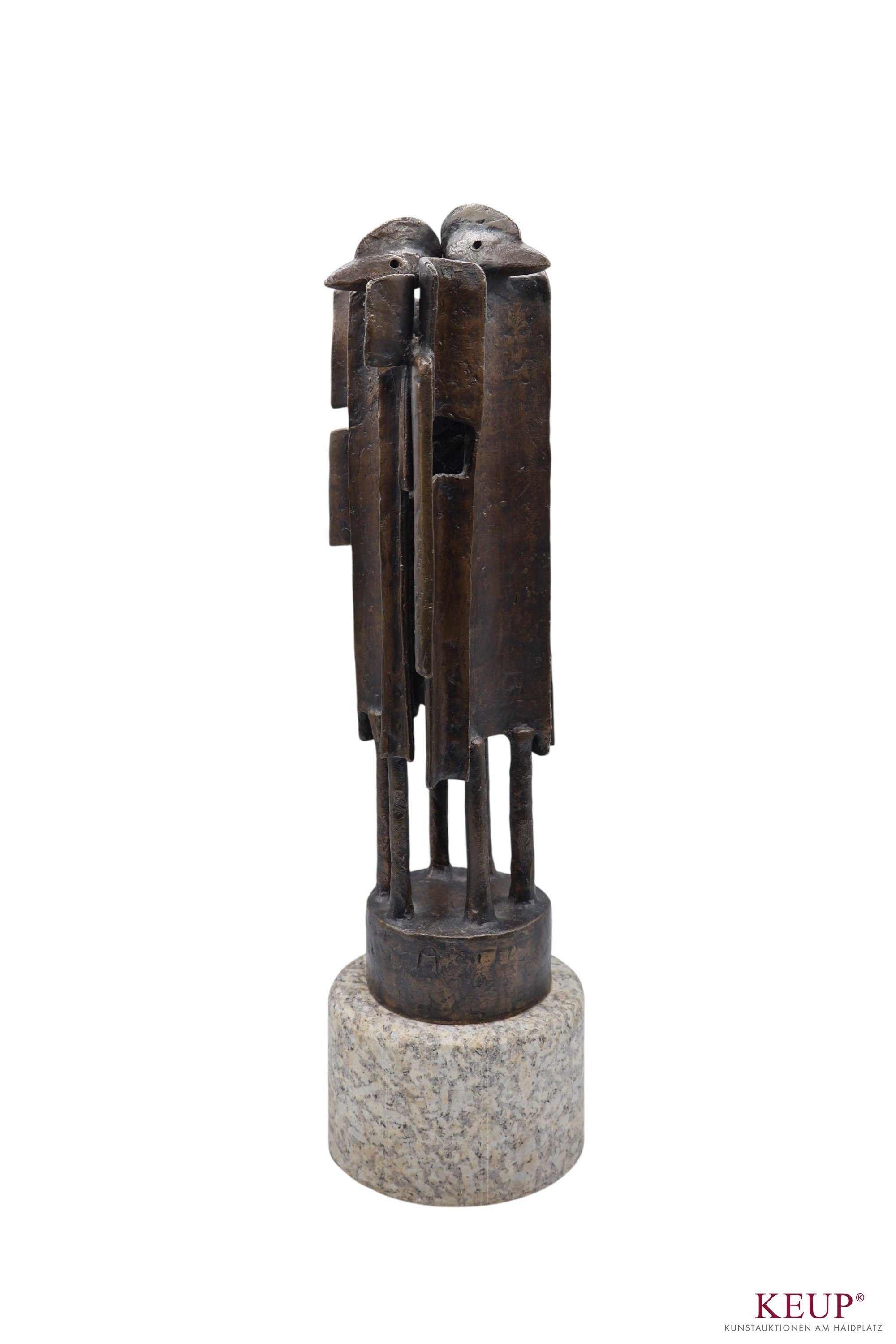 Figurengruppe - Peter Mayer (1938 Schwandorf / Bayern 2009) ''Drei Vogelwächter'', monogrammiert und datiert (20)04 Bronze auf Steinsockel, Höhe ca. 42,5 cm, ca. 5,7 kg, Provenienz: Private Oberpfälzer Kunstsammlung vgl. Literatur: Staatl. Fachschule für Keramik in Landshut, 1958-64 Akademie der Bildenden Künste München, seit 1964 freischaffender Bildhauer in Schwandorf 1974 Ostbayerischer Kulturpreis OBAG 1991, 94, 98 Stipendium und Aufenthalt im V.C.C.A, USA Ausstellungen: 1975 Miami Beach, I.C.S. Conv. 1976 Galerie Bürdecke, Zürich 1977 Kunstmesse Köln, Kunsthaus Lübeck 1978 Galerie Sphinx, Amsterdam 1984 Tassilo Galerie, Nürnberg 1984 Galerie im DEZ, Regensburg 1985 Galerie Lange Straße, Baden-Baden 1988 Oberpfälzer Künstlerhaus, Schwandorf 1992 Musée des Beaux-Arts, Libourne 1997 St. Anna Kapelle, Passau 1998 Kleine Galerie, Regensburg 1999 Kapuziner Stadl, Deggendorf Öffentliche Ankäufe / Kunst im öffentlichen Raum: Museum der Stadt Regensburg, Bay. Staatsgemäldesammlung München Universität Regensburg, Bezirk Oberpfalz, viele Arbeiten im öffentlichen Raum