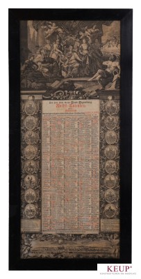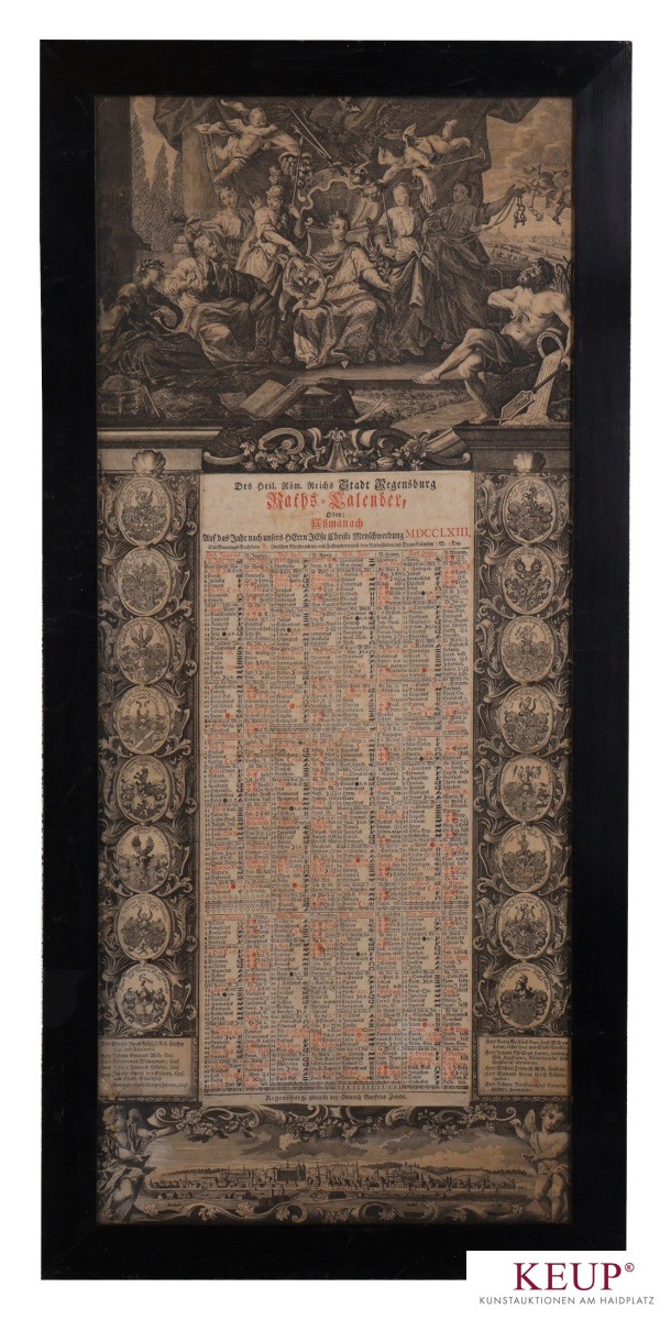 Kupferstich - Regensburg 1763 ''Raths-Kalender der Reichs Stadt Regensburg'', gedruckt in Regensburg bei Heinrich Gottfried Zunkel, Kopfstück mit Allegorischer Darstellung, zentrale Kalenderdarstellung, flankiert von Wappen der Ratsherren, darunter Ansicht der Stadt Regensburg, Altersspuren, Maße Darstellung ca. 77x32,5 cm, schwarze Rahmenleiste, Provenienz: Privatbesitz Regensburg
