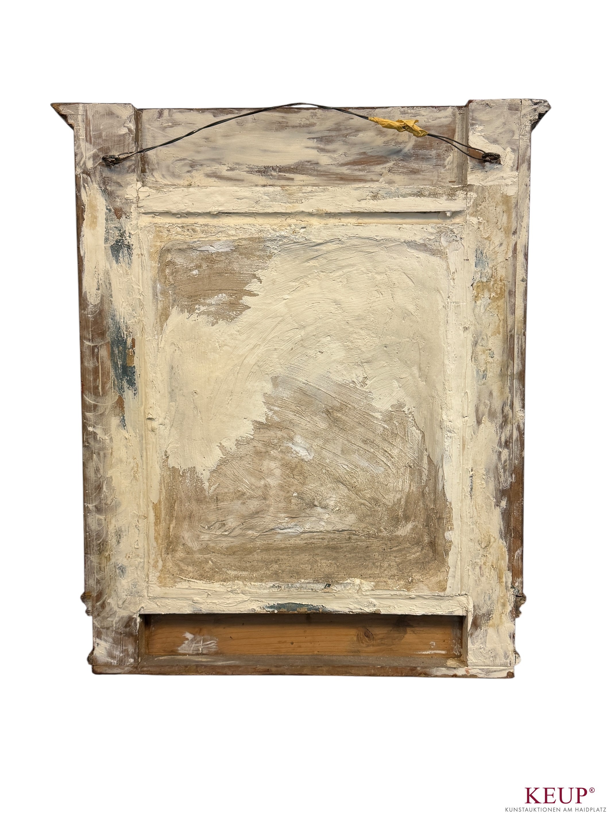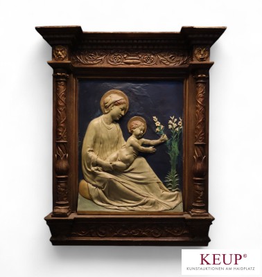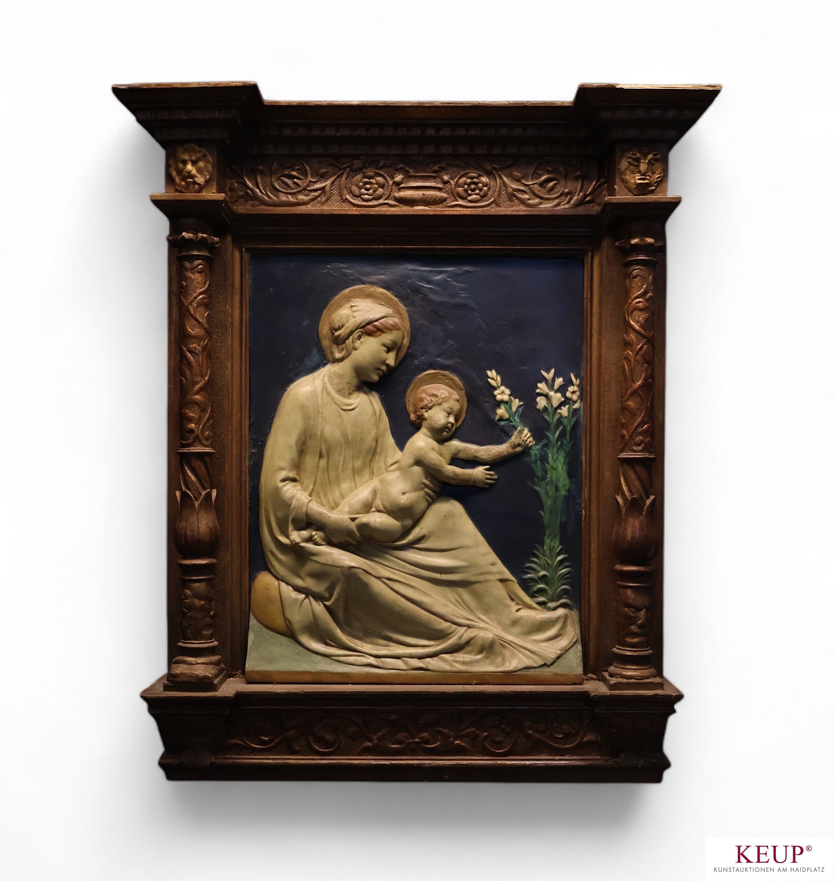Relief - nach Renaissancevorbild Luca Della Robbia (um 1400 Florenz - 1481) ''Madonna und Kind'', evtl. Felix Nanny München um 1890, Holzrahmen mit Säulen und Maskaronen, Beschädigung am Relief restauriert (siehe Foto Rückseite), Gesamtmaße ca. 74x61x13 cm