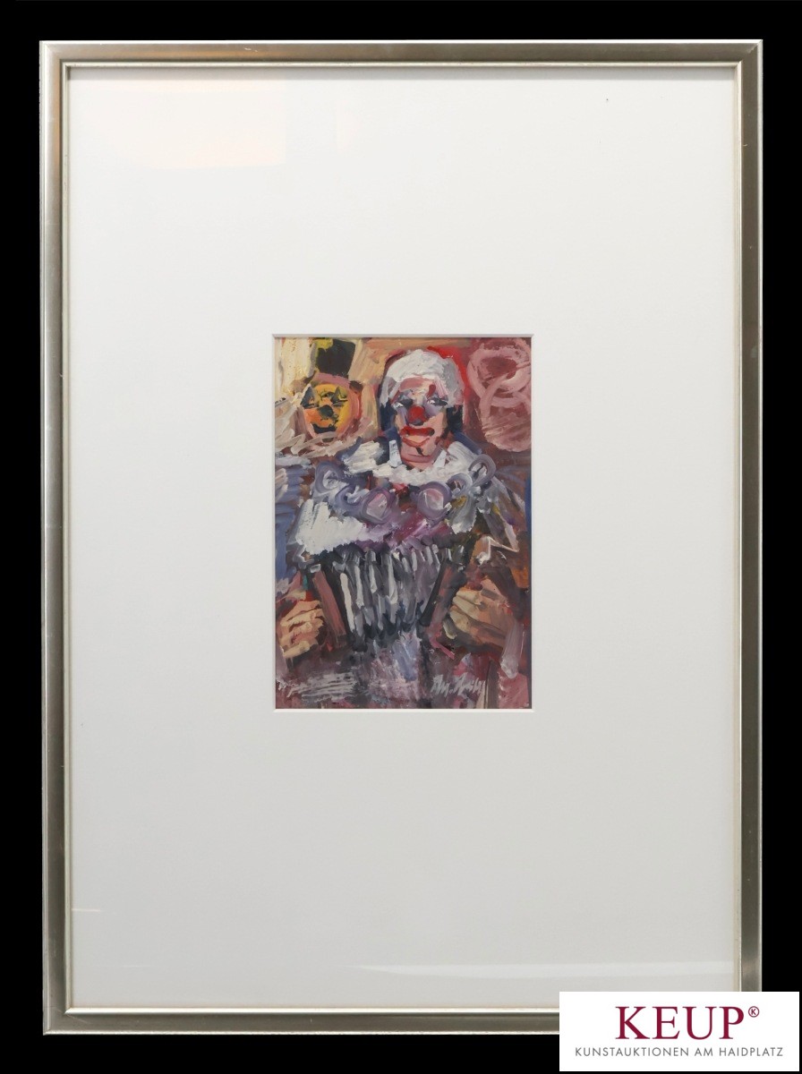 Gemälde - Rupert Preißl (1925 Eitlbrunn bei Regensburg - 2003) ''Clowns'', r.u. signiert, Mischtechnik auf Papier, Maße Darstellung ca. 27,5x19 cm, Passepartout, Rahmen, Gesamtmaße ca. 73x52,5 cm, Provenienz: Privatsammlung Regensburg, vgl. Lit.: Maler und Graphiker; erste künstlerische Ausbildung in Nürnberg bei Prof. H. Gradl, 1947-1952 Studium in München und Törwang bei Prof. Gerhardinger. Zusammenarbeit mit A.Kubin und W.Niedermayer. Preise: 1974 Kulturpreis Ostbayern; 1979 Kulturpreis Regensburg, 1984 Bundesverdienstkreuz 1.Klasse, 1991 Bayerischer Verdienstorden, etc.,,