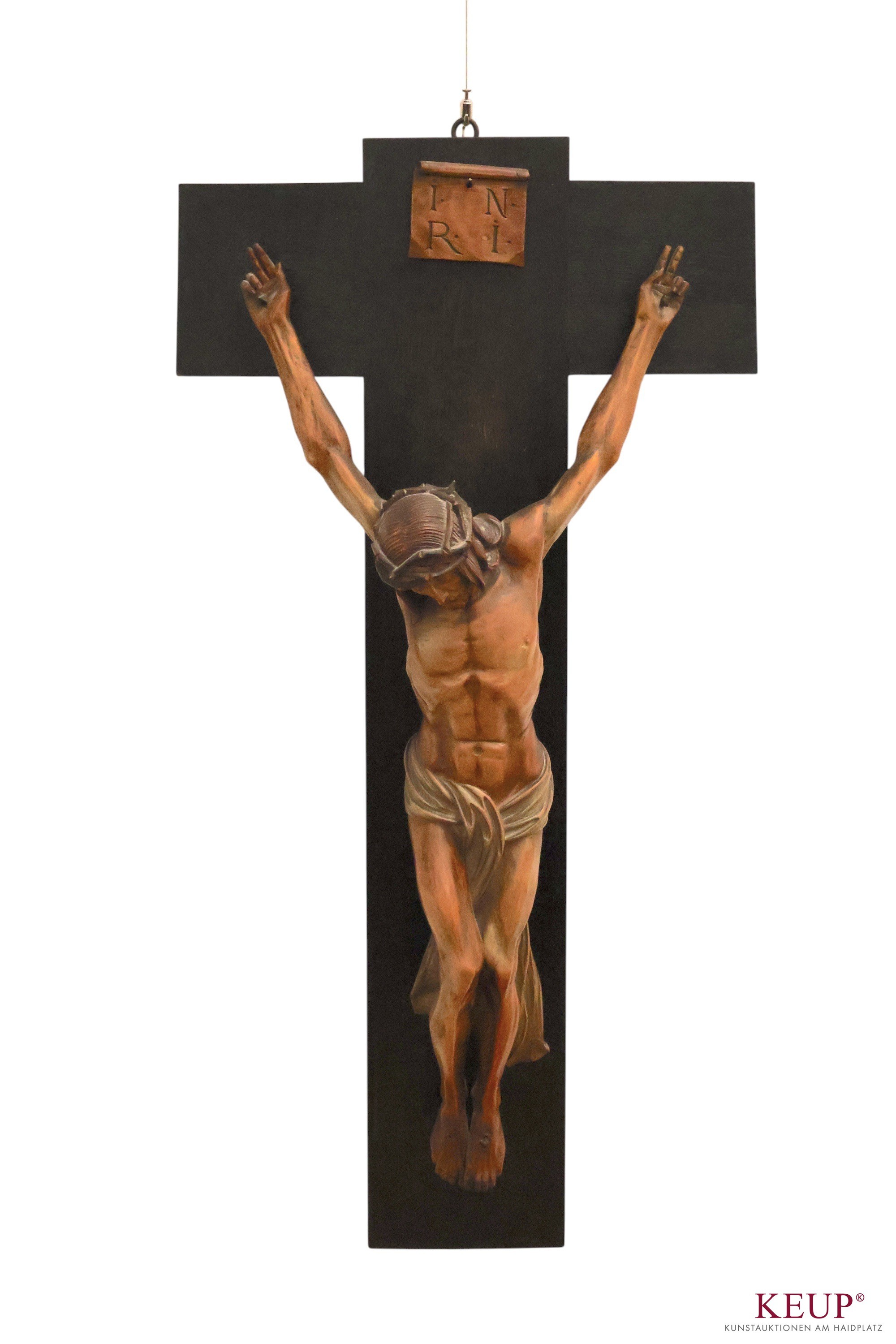 Kreuz mit Korpus Christi - anonymer Bildhauer (XX.Jahrhundert) Viernageltypus, Holz geschnitzt, Lendendraperie, Gesamtmaß ca. 110x52 cm, Provenienz: Privatbesitz Oberbayern aus Regensburger Nachlass