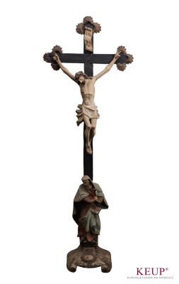 Standkreuz - wohl deutsch 18./19.Jahrhundert Korpus Christi als Dreinageltypus, darunter Marienbildnis, geschweifter Sockel rückseitig beschriftet Von den Patern der Redemptoristen 1870 geweiht, Holz geschnitzt und gefasst, Maße ca. 100x34 cm, Altersspuren, Provenienz: Privatbesitz Landkreis Regensburg