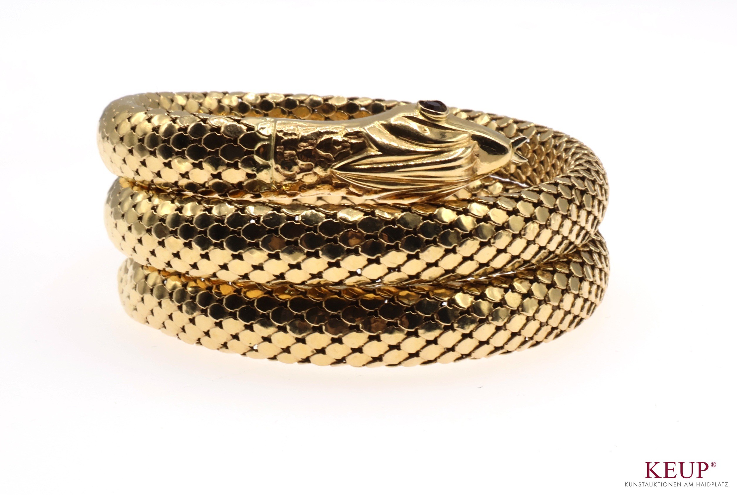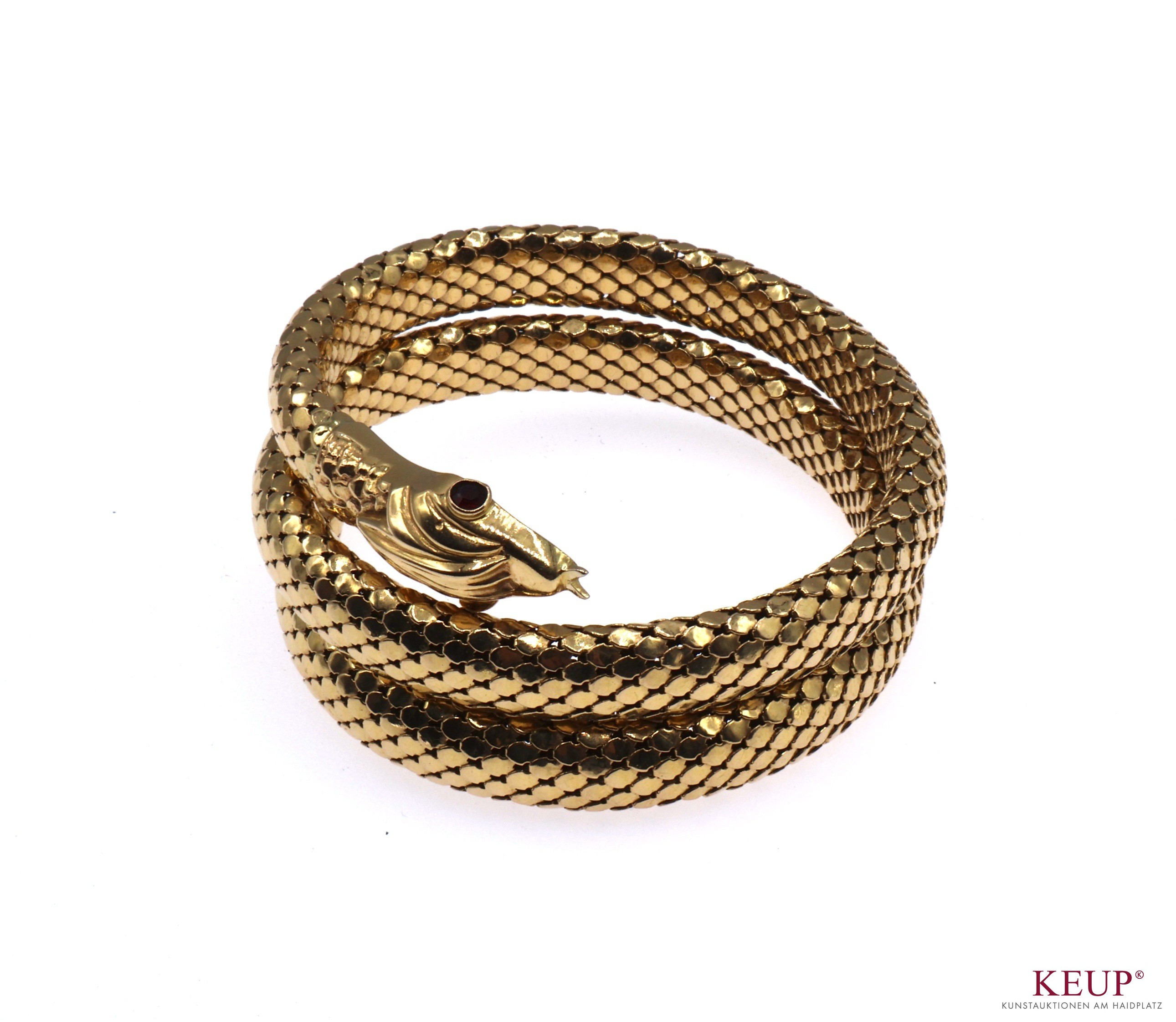 Vintage - Goldener Schlangenarmreif gemarkt Gold gest. 750 und 252 vi, Armband schuppenartige Oberfläche, verziert mit 2 Rubinen (Augen), filigrane Arbeit, dehnbar durch innenliegendes Metallband, d.= 6 cm, ca. 73 Gr., Provenienz: Privatbesitz Chiemgau