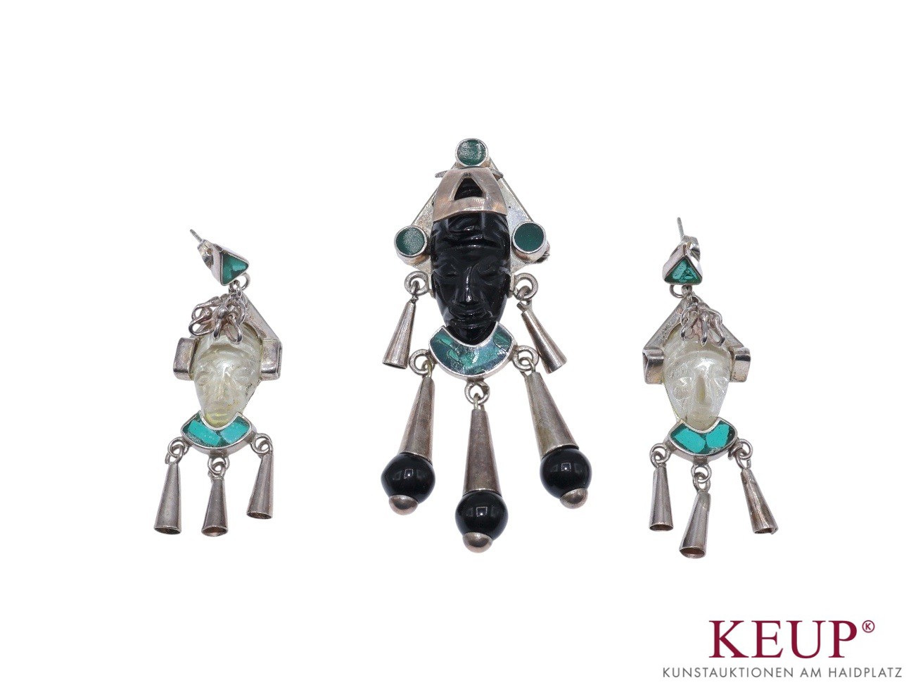 Schmuckset - Mexiko XX.Jahrhundert Silber undeutlich gemarkt,, u.a. verziert mit Onyx und Malachit, bestehend aus: Brosche (bzw. Anhänger) und zwei Ohrsteckern, Länge ca. 4,5 bis 6,5 cm, Provenienz: Privatbesitz Landkreis Regensburg